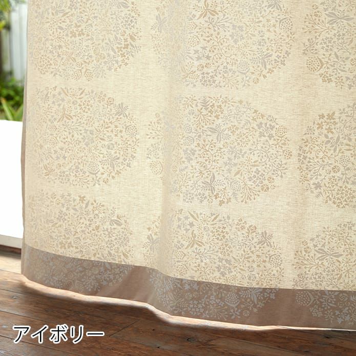 ナチュラルな北欧プリントカーテン アパレルブランド「Ugai」を主宰する鵜飼甘菜さんのデザイン。 綿と麻の混紡糸を使った生成りの生地に顔料プリントをしています。 草木のモチーフで大きなサークルを描いた北欧ナチュラルカーテン。
