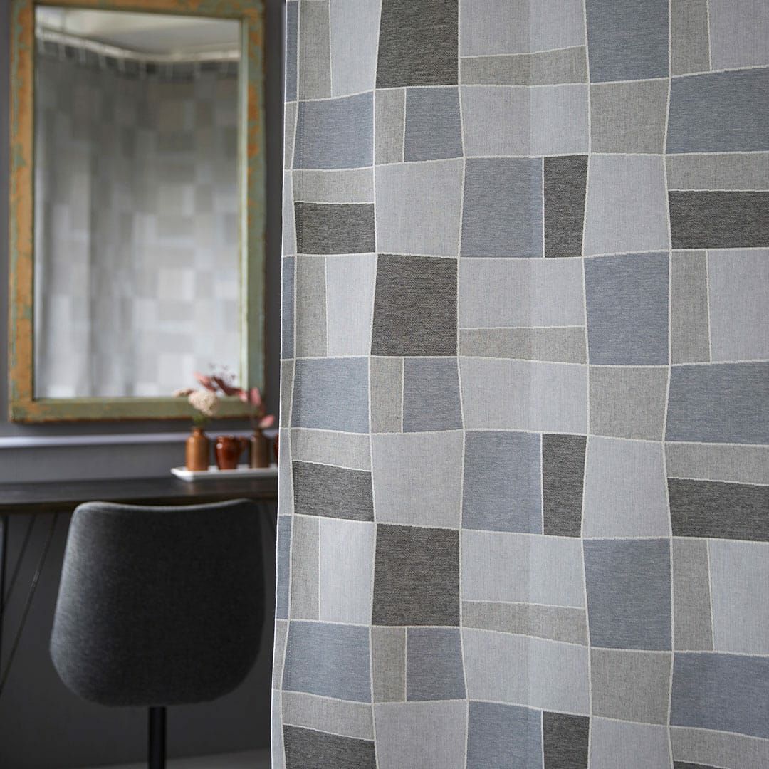 タテに綿と混紡糸、ヨコに綿糸を使った先染めジャガード織りカーテン。 ブロックごとに組織を変えてパッチワーク風に同系色で仕上げたシックな装い。