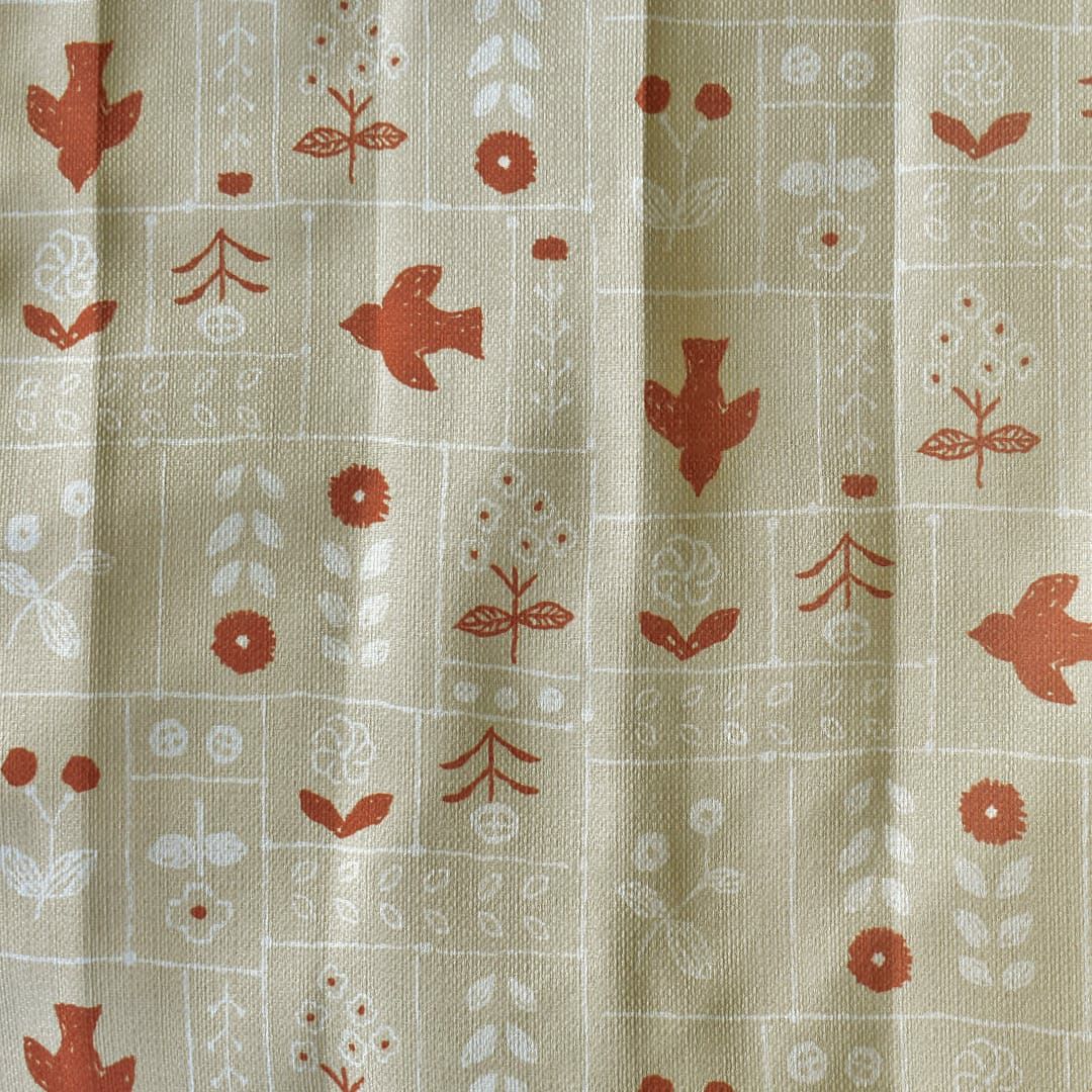自由に描いた線と、刺繍のような鳥とお花をプリントしたカーテン。 ざっくりとしたベージュ生地にブラウンの鳥と、ブラウンと白の線で描かれたお花がアクセントになっています。 カジュアルテイストのお部屋に合います。