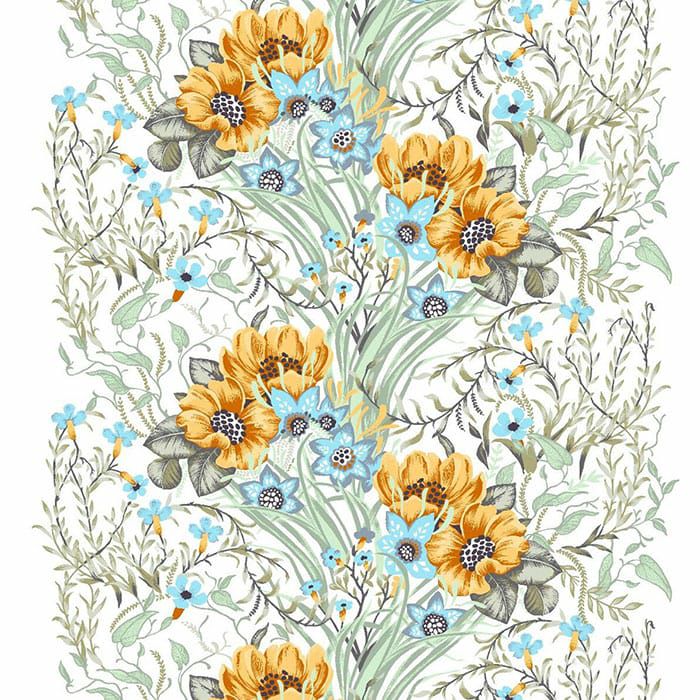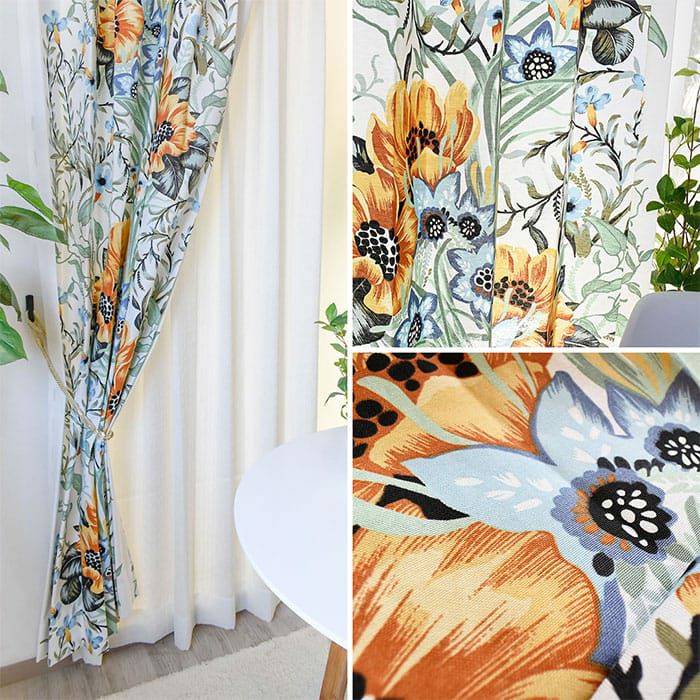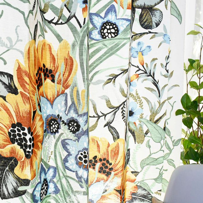 グリーンやブルーの落ち着きある色にアクセントのオレンジが映えるカーテンです。 白い生地に大胆に描かれた美しい花柄でエレガントなお部屋におすすめです。