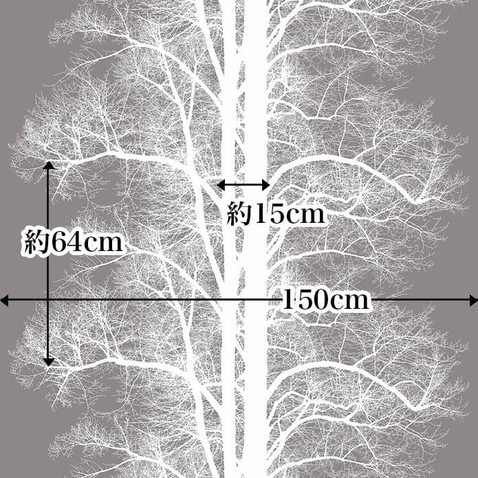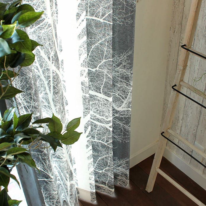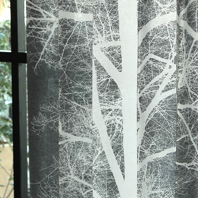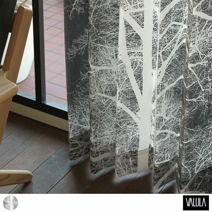 灰色の生地に白く繊細な枝のシルエットが浮かび上がるデザイン。 フィンランドの厳しい冬の森に立つ大きな木をイメージしています。 ぐっと抑えたグレーに白一色で描く潔い構図ですので、 ぜひフラットカーテンでお楽しみください。 デザイナー Tanja Orsjokiが描いた作品です。