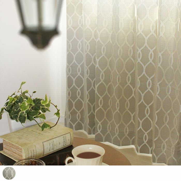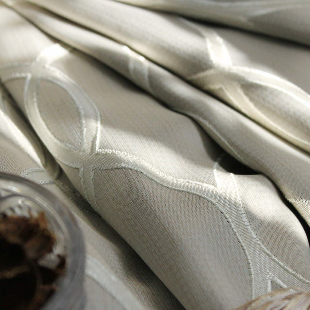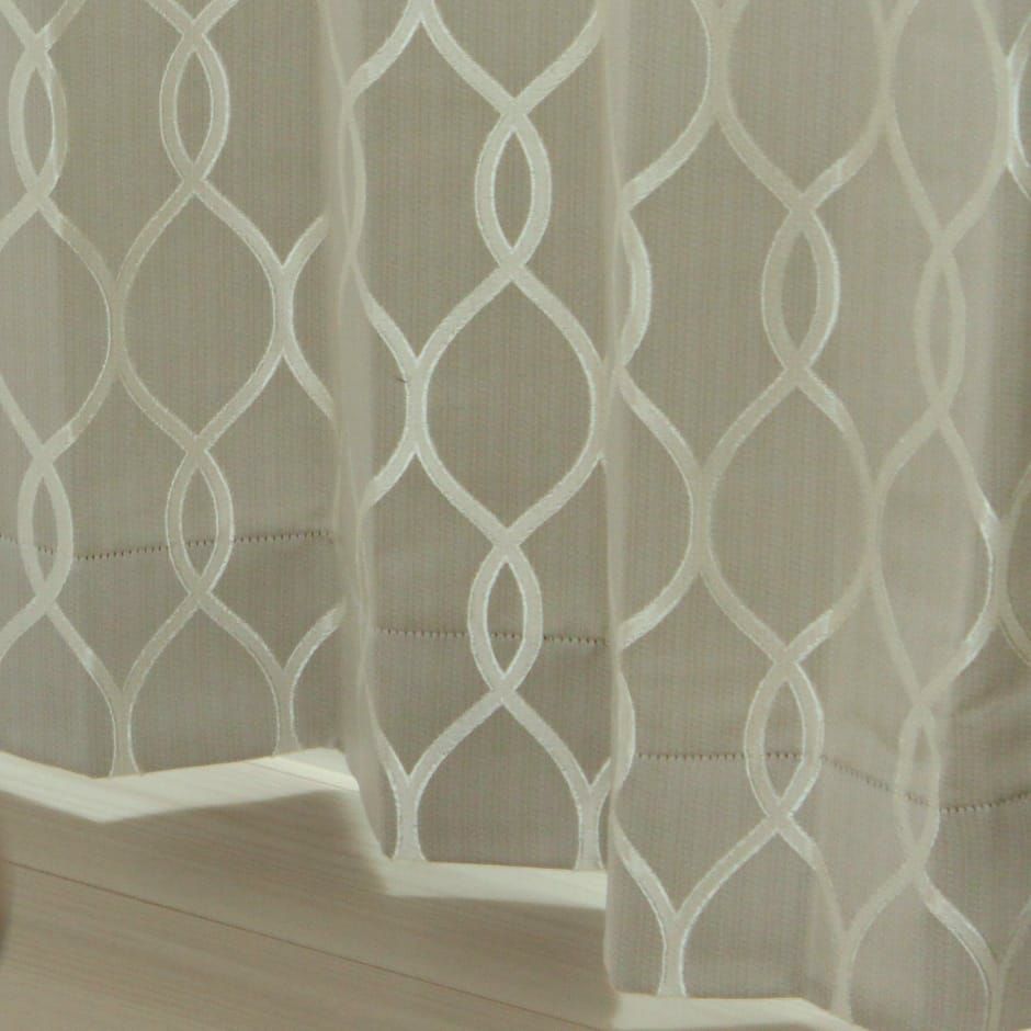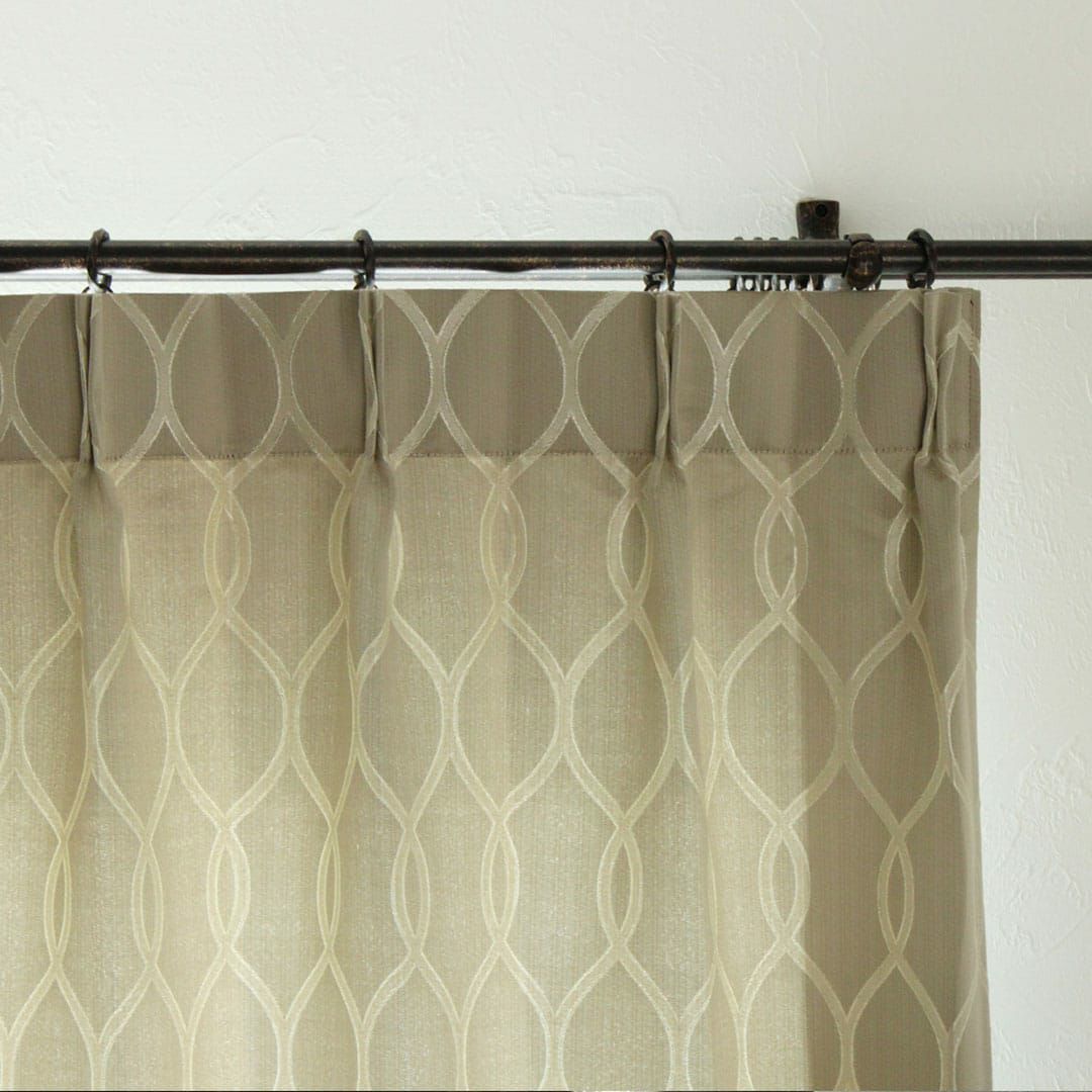 (使用アイテム:タッセル ジャスミン(ベージュ))ベージュやアイボリーがMIXされた淡いグレー地にアイボリーのモダンな鎖柄が美しいエレガントなカーテン。光沢のある生地と上品な幾何学模様でお部屋がワンランクアップ! ※写真は全て1.5倍ヒダ+形状記憶加工です。