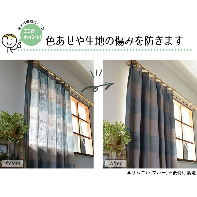 天然素材(綿、麻タイプ)は、太陽の光による色あせがしやすい傾向にあります。裏地カーテンを付けることによって、生地やプリント柄の色あせを抑えたり、生地を保護し劣化を防ぎます。
