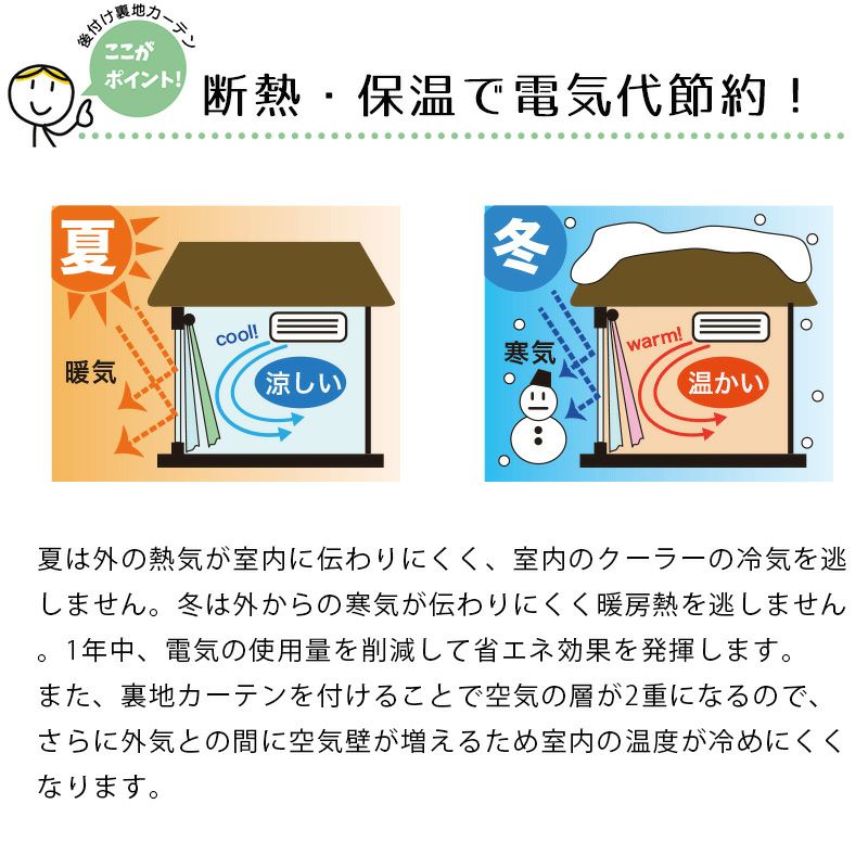 また、裏地カーテンを付けることで空気の層が2重になるので、さらに外気との間に空気壁が増えるため室内の温度が冷めにくくなります。