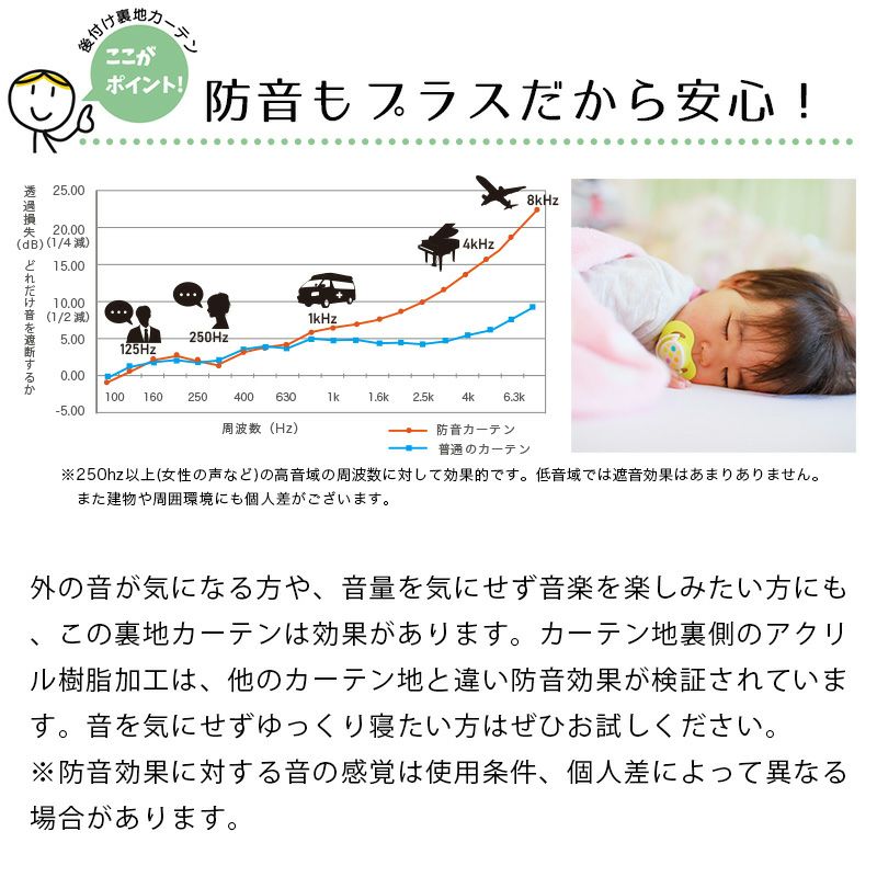 外の音が気になる方や、音量を気にせず音楽を楽しみたい方にも、この裏地カーテンは効果があります。カーテン地裏側のアクリル樹脂加工は、他のカーテン地と違い防音効果が検証されています。音を気にせずゆっくり寝たい方はぜひお試しください。