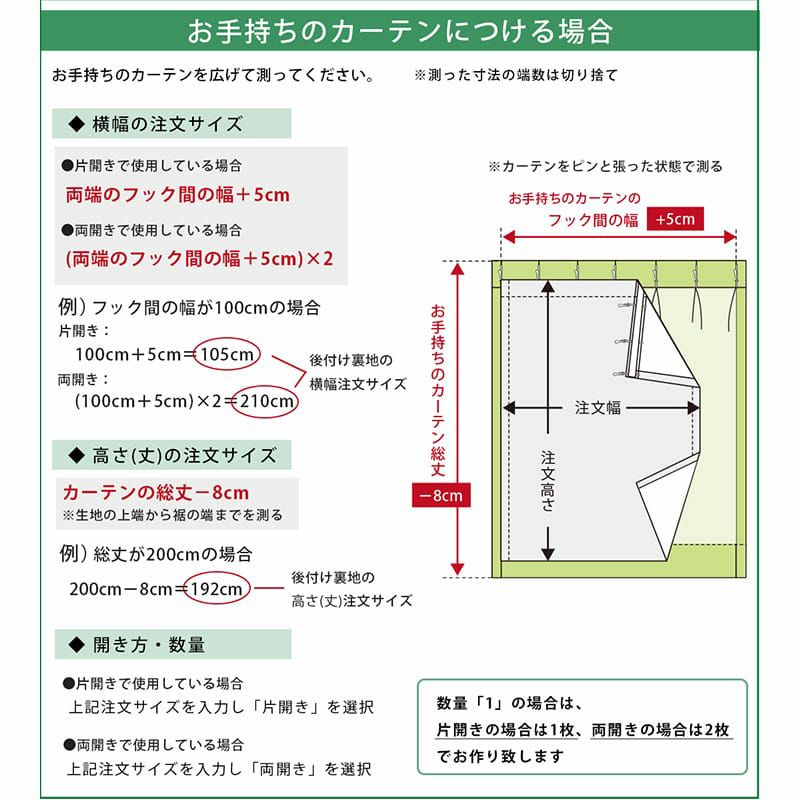 ご注文のカーテンの幅、高さとは、後付け裏地の仕上がり寸法のことです。 必ずサイズの測り方をご確認の上、仕上がり寸法を計算してご入力ください。