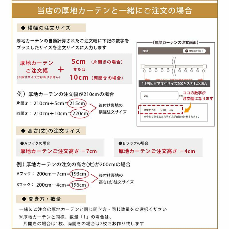 ・オーダーサイズのドレープカーテンと一緒にご注文する場合は、ご注文の際に備考欄に「○○生地用の後付け裏地カーテンを希望」とご記入ください。
