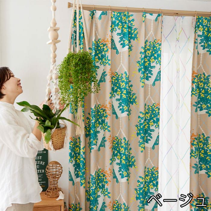 ▲ベージュ フラワーポットを、リズミカルに構成した大胆なデザイン。 この大胆なデザインのカーテンを窓辺につるせば、 お部屋全体をパッと明るく、華やかなにしてくれます。 ※写真は全て1.5倍ヒダ+形状記憶です。