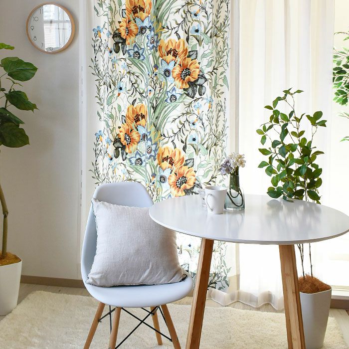 グリーンやブルーの落ち着きある色にアクセントのオレンジが映えるカーテンです。 白い生地に大胆に描かれた美しい花柄でエレガントなお部屋におすすめです。