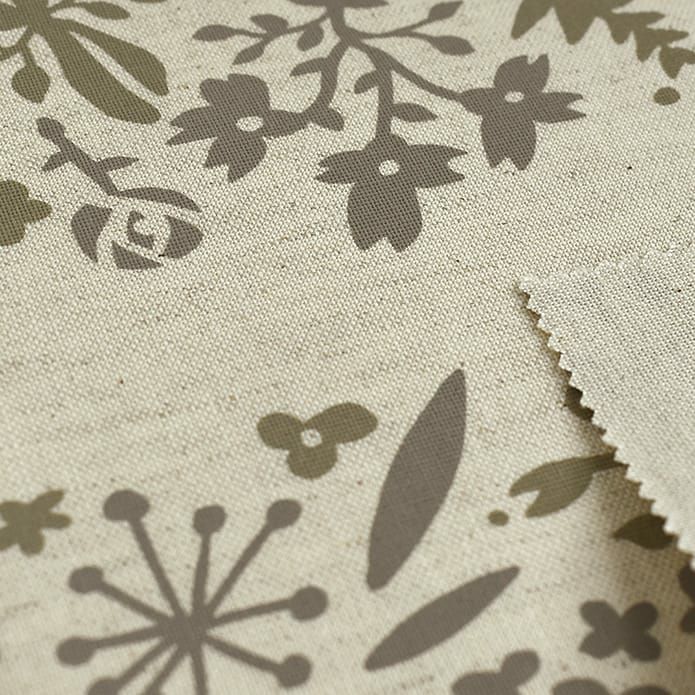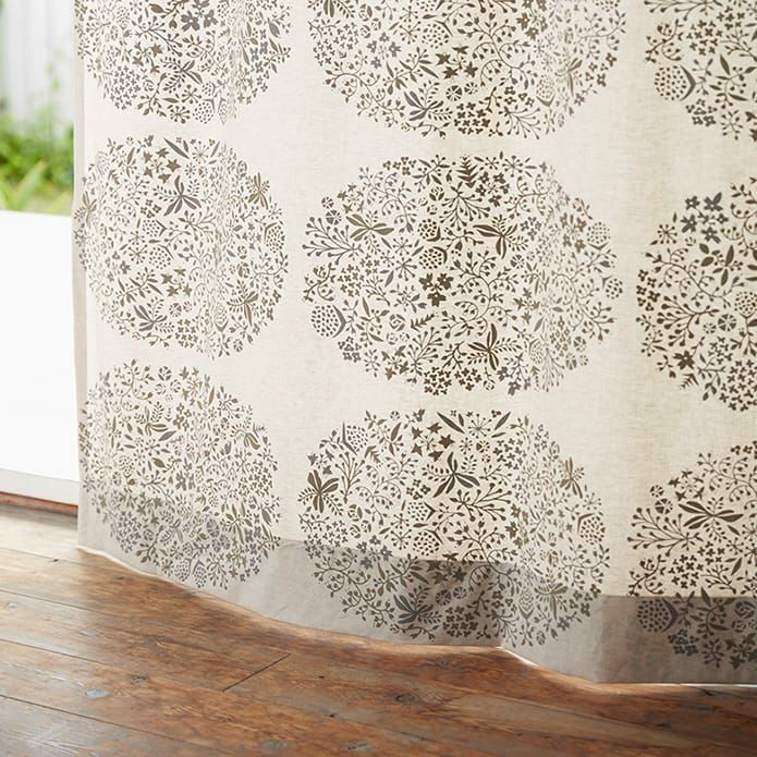 ナチュラルな北欧プリントカーテン アパレルブランド「Ugai」を主宰する鵜飼甘菜さんのデザイン。 綿と麻の混紡糸を使った生成りの生地に顔料プリントをしています。 草木のモチーフで大きなサークルを描いた北欧ナチュラルカーテン。