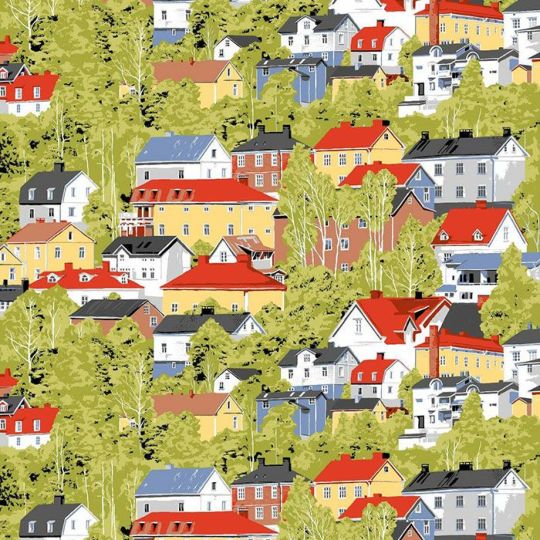 自然の中にある色とりどりの家や街並みが描かれています。 一枚の絵画を見ているような美しいデザインです。 ヴィンテージスタイルのお部屋にアクセントとしてオススメです!
