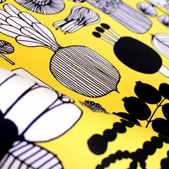 「最高の庭師」を意味するプータルフリン パルハート 庭で育った草花や野菜がいっぱいでワクワクするデザインです。 イエローの生地が北欧らしく、お部屋のアクセントになります。 小柄なので腰窓や小窓におススメです。 デザイナー:マイヤ・ロウエカリ