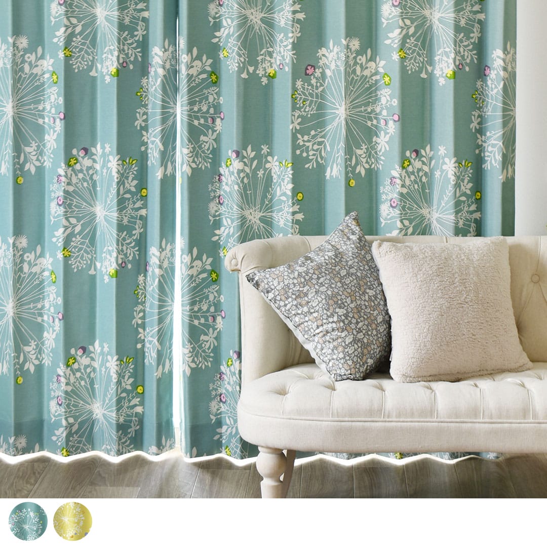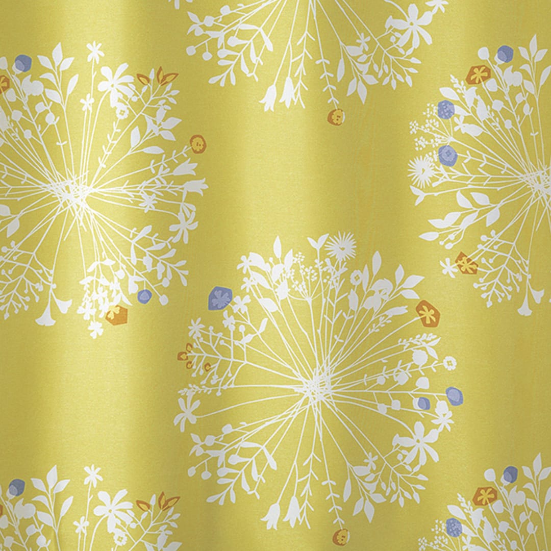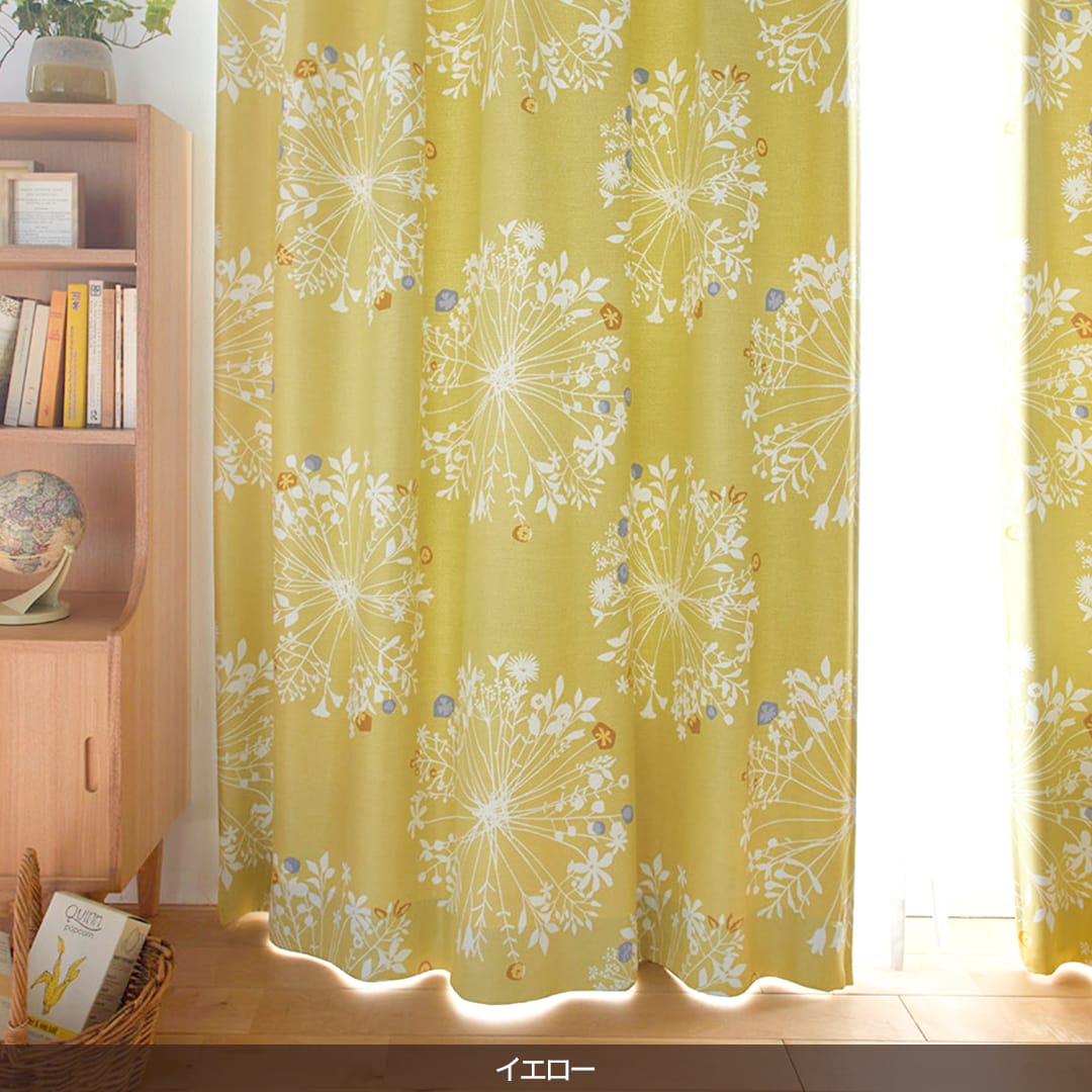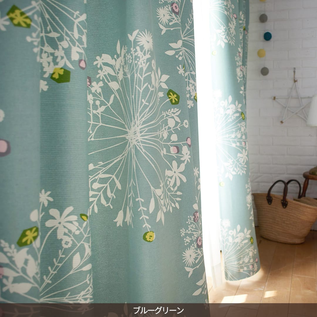 大きくて優しい花束のモチーフがいっぱい。 繊細なボタニカルデザインは、 白木のインテリアや窓に似合います。 ちょっとしたアクセントカラーが効いています。 遮光2級なので眩しい朝日や西日をほどよく遮ってくれますよ。