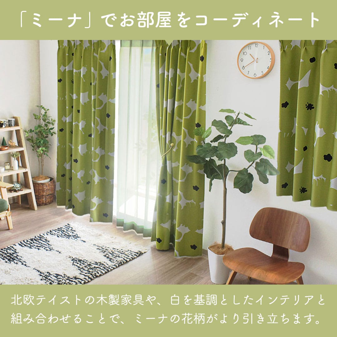 ▲【コーディネート商品】カーテン:ミーナ(グリーン)、レースカーテン:レインボー(グリーン) 北欧テイストの木製家具や、白を基調としたインテリアと組み合わせることで、ミーナの花柄がより引き立ちます。 さらに無地のレースカーテンと合わせることで、柄が主張しすぎずバランスの良い空間に仕上がります。