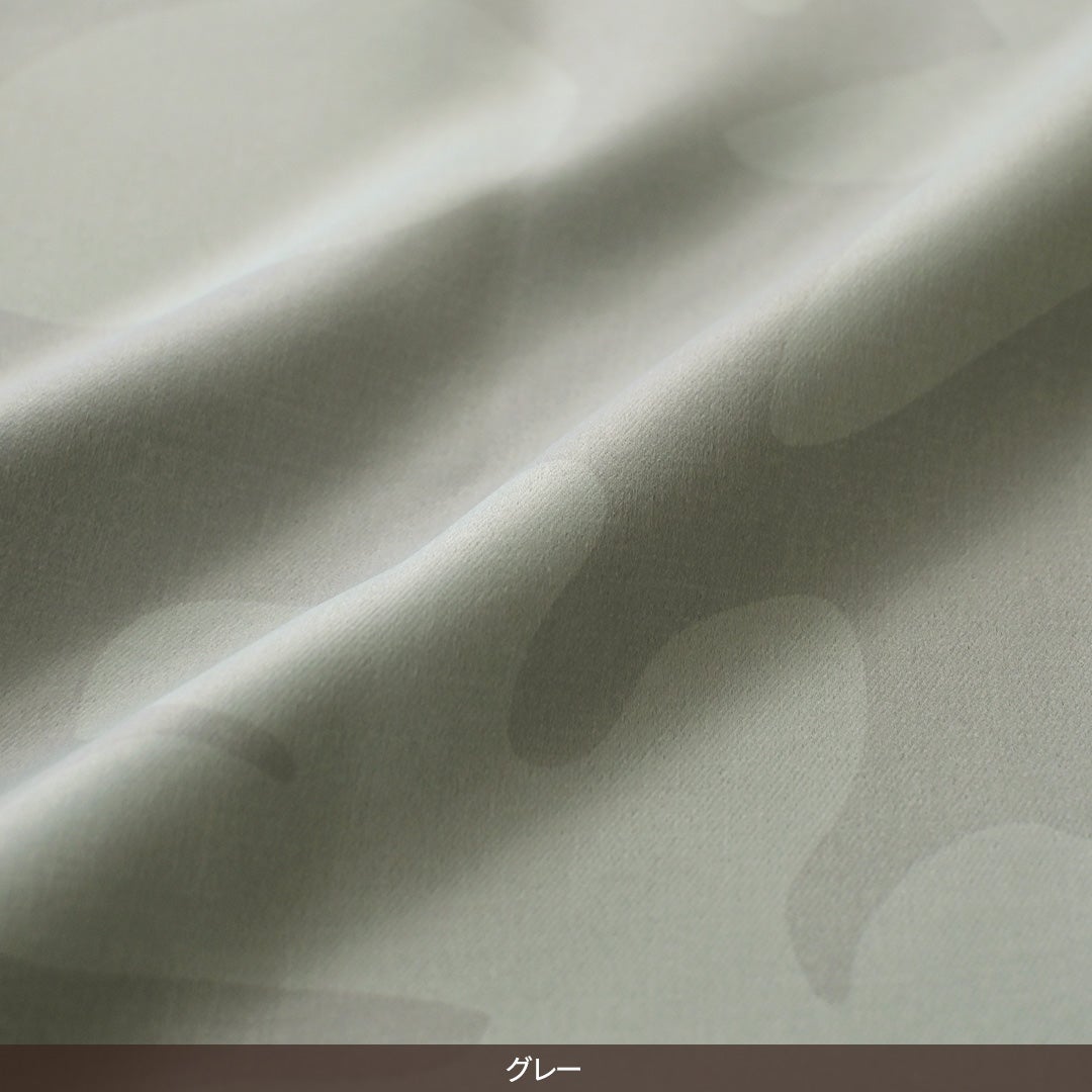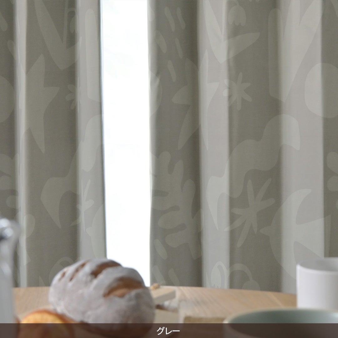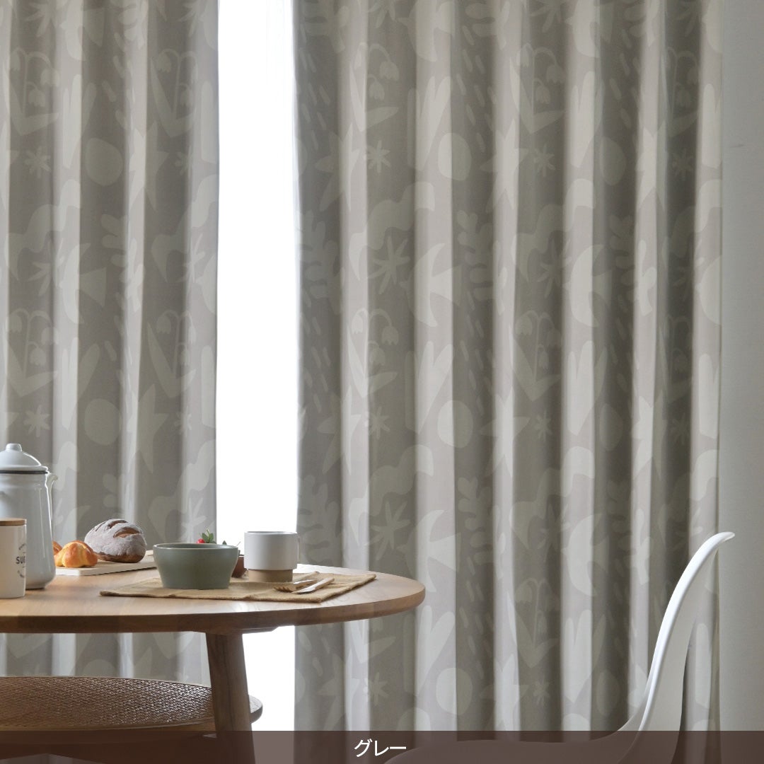 くすみ色のモチーフが重なり合ったデザインの遮光カーテン