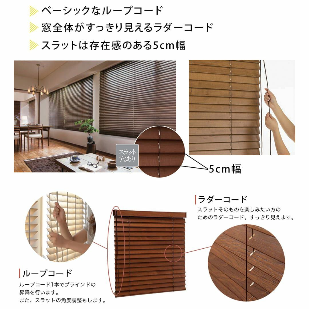 シンプルなループコードはスラットに穴が開いていて、そこをコードが通ります。スラット幅は存在感のある5cm幅でよりウッディに感じていただけます。