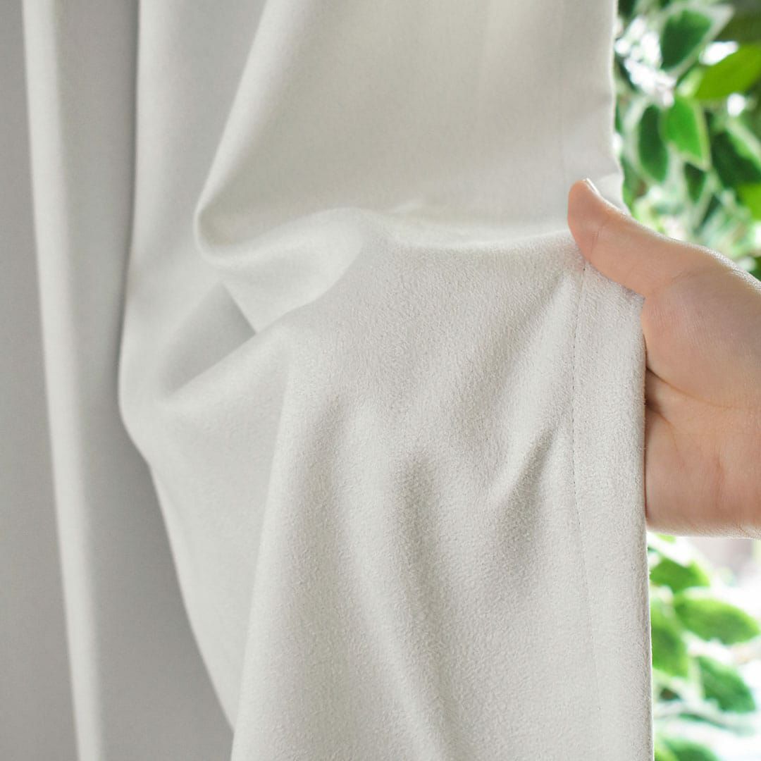 生地を起毛させているのでふっくらと柔らかな風合いです。 ベロア調な生地感に仕上がるので、高級感があります。 清潔感のある白はホテルライクなお部屋にぴったりです。 遮光生地なので日差しが強い小窓や腰窓にもおすすめです。