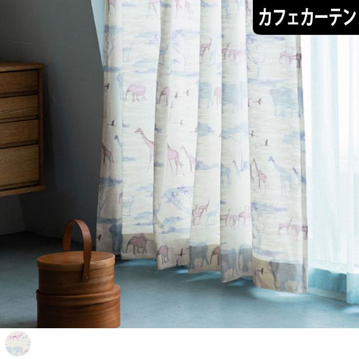 動物たちの大群がまるでアフリカのサファリにいるよう。 水彩画のような優しく淡いタッチで描かれているので 大人でも楽しめるデザインです。 日のあたる窓に、カラーレースと組み合わせてスタイリッシュに使えます。 淡い色合いが夕日に映えてかわいくも美しいカーテンです。