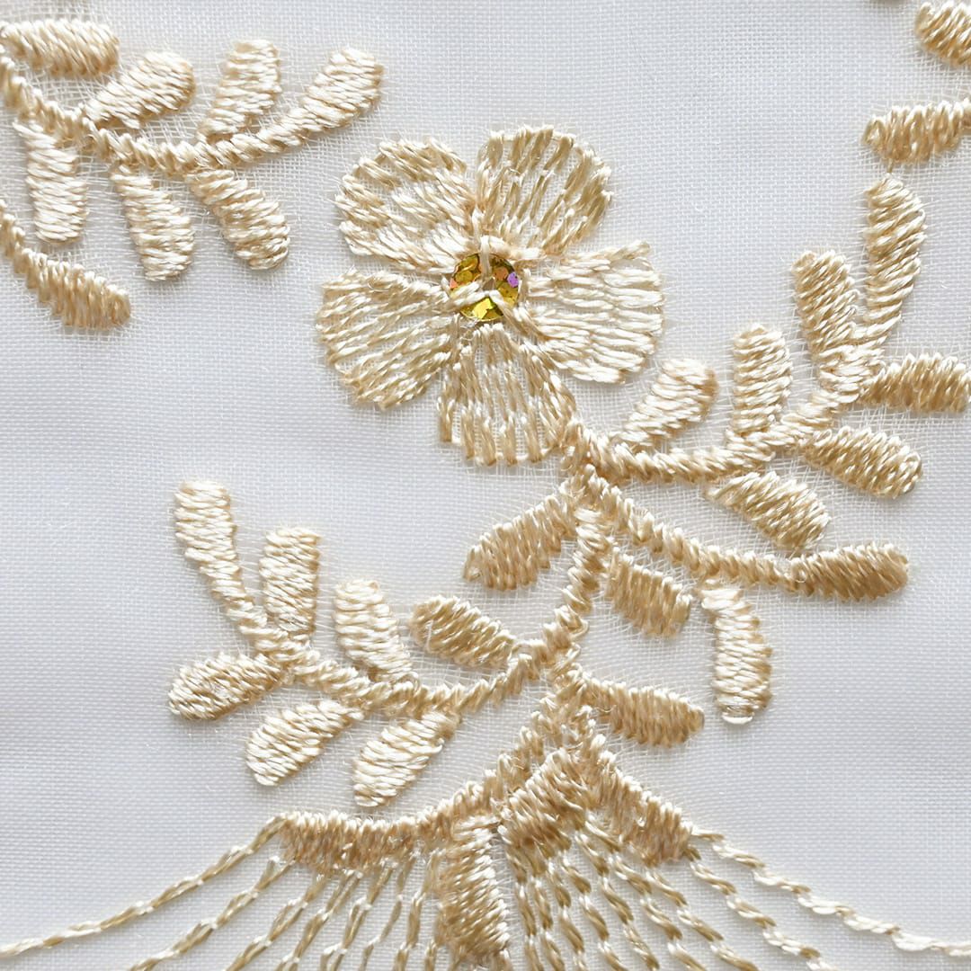 スパンコールをあしらったお花と、孔雀の尾が広がったようなデザインで裾のスカラップ仕上げが上品でエレガントに見えます。