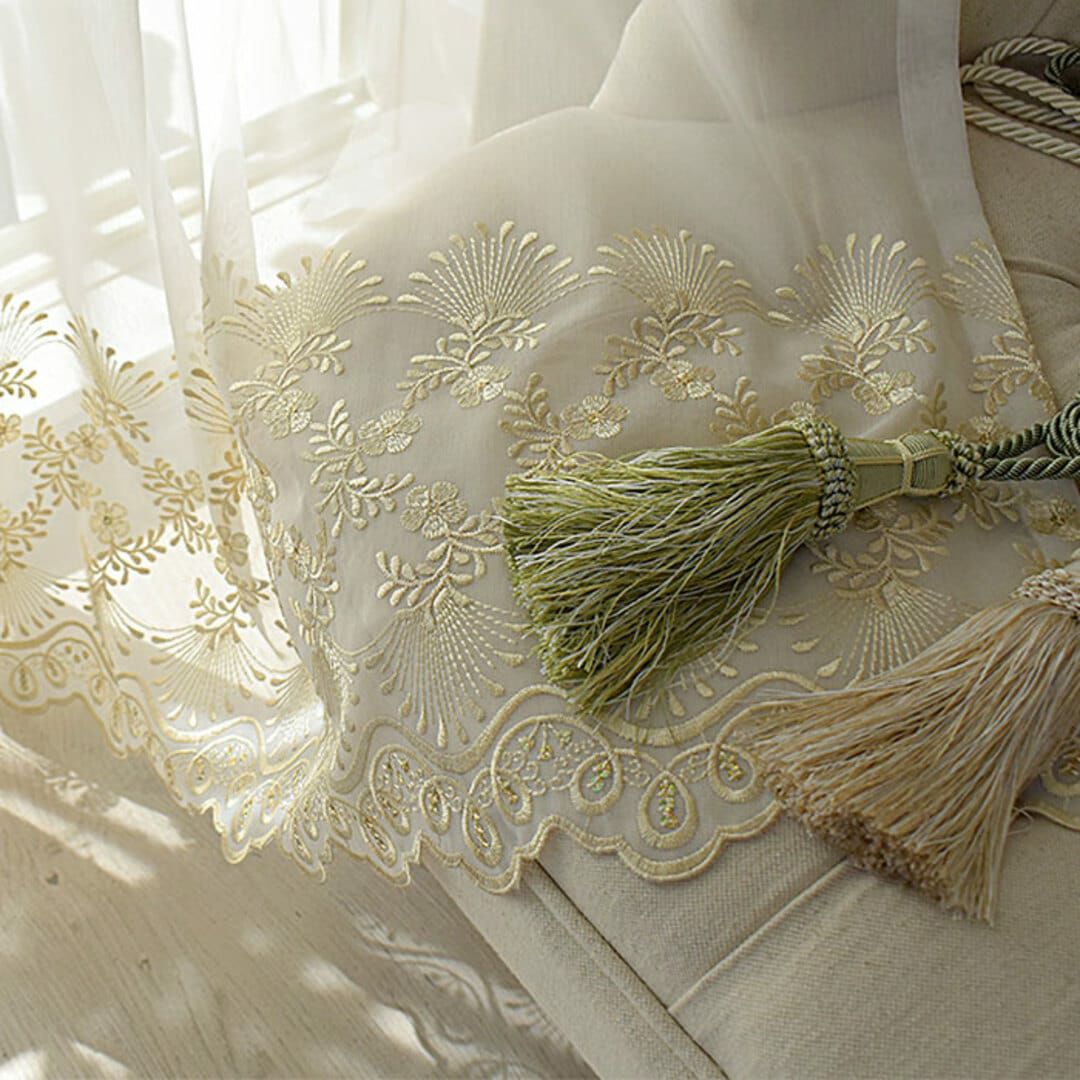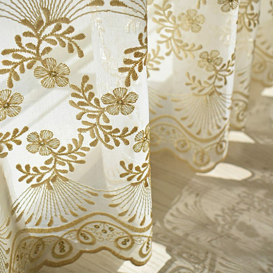 シャンパンゴールドの華やかなトルコ刺繍のレースカフェカーテン