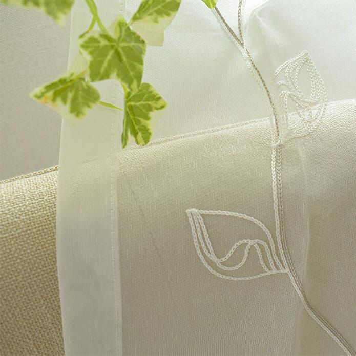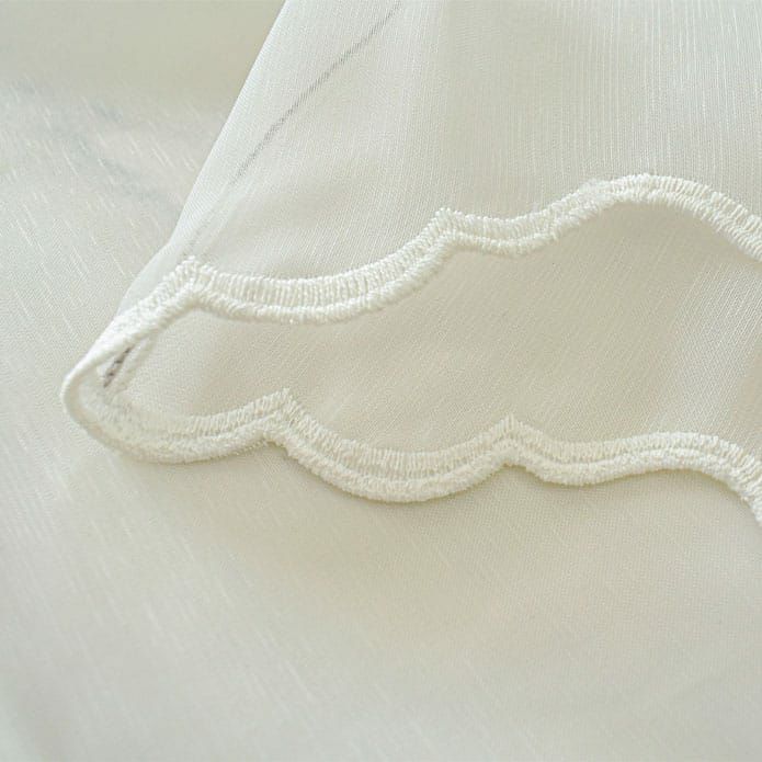 白とグレーの糸を使用して刺繍された花は まるで水の中をゆらゆら漂っているような躍動感を感じます。 また生地は縦方向にうっすらと地模様があるスパンボイルを使用。 透け感が全くの無地よりやさしい印象を与えます。