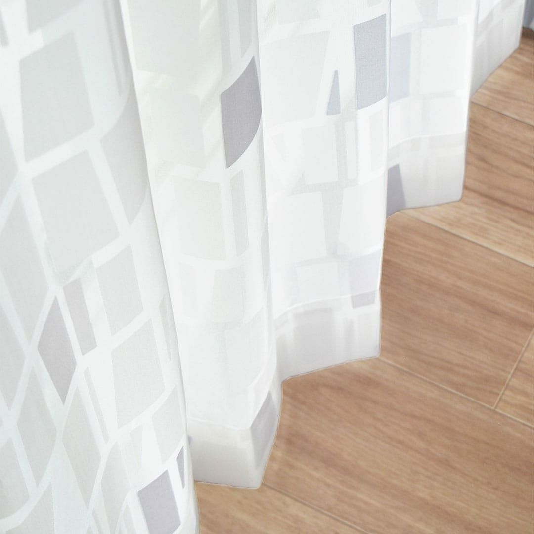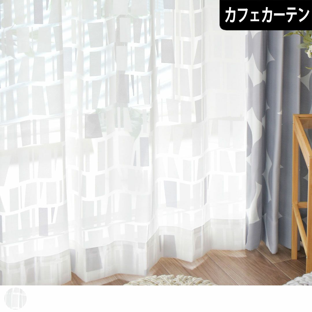 ホワイトとグレーの幾何学モチーフが並ぶ 北欧テイストのレースカフェカーテン