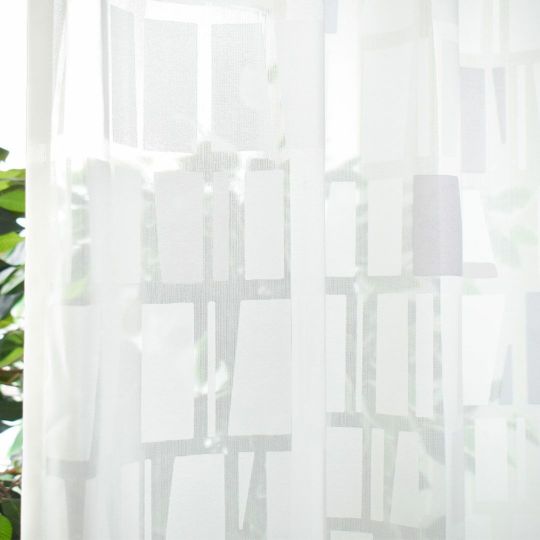 ドミノのように四角のモチーフが並ぶ楽しいデザイン。 ホワイトの生地にホワイトとグレーの幾何学デザインがおしゃれで、北欧テイストのお部屋に良く合います。