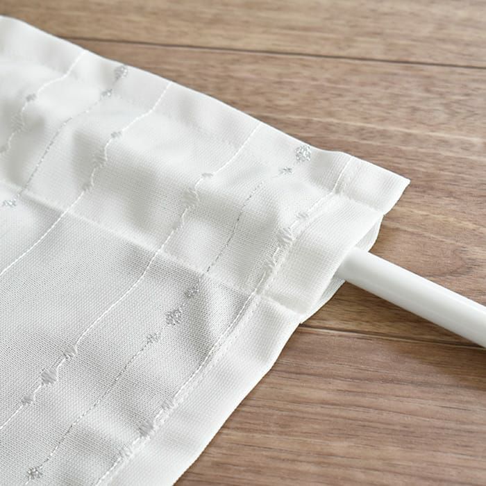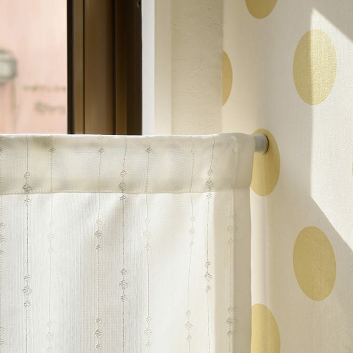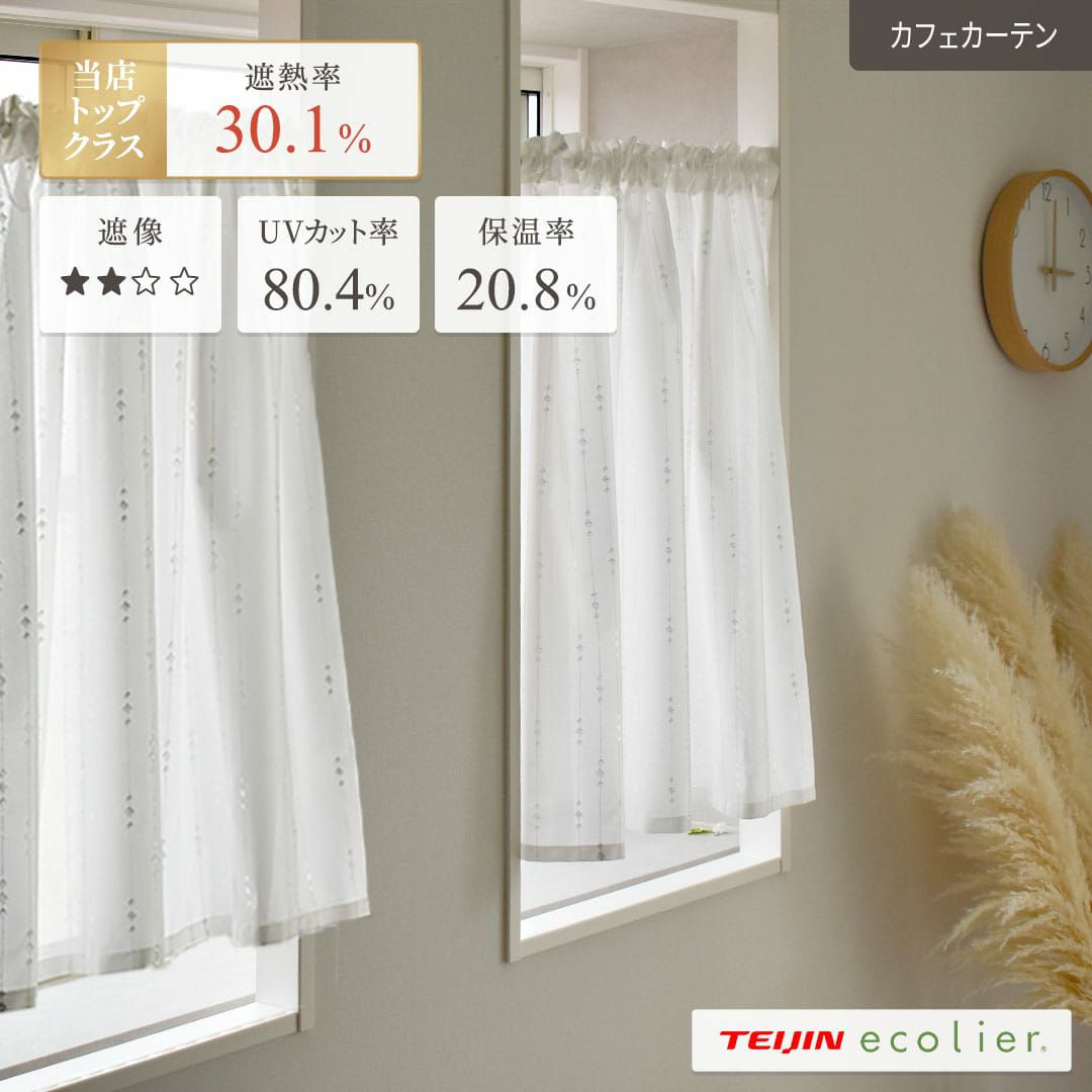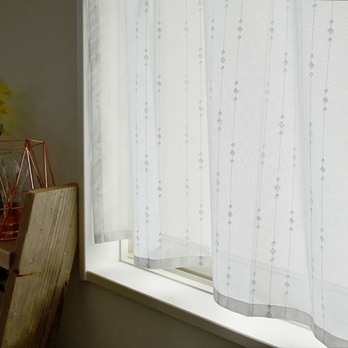 帝人の「エコリエ」の糸を使用したミラーレースカフェカーテンです。 飽きのこない光沢のあるストライプの刺繍でちょっとおしゃれな小窓にぴったりです。