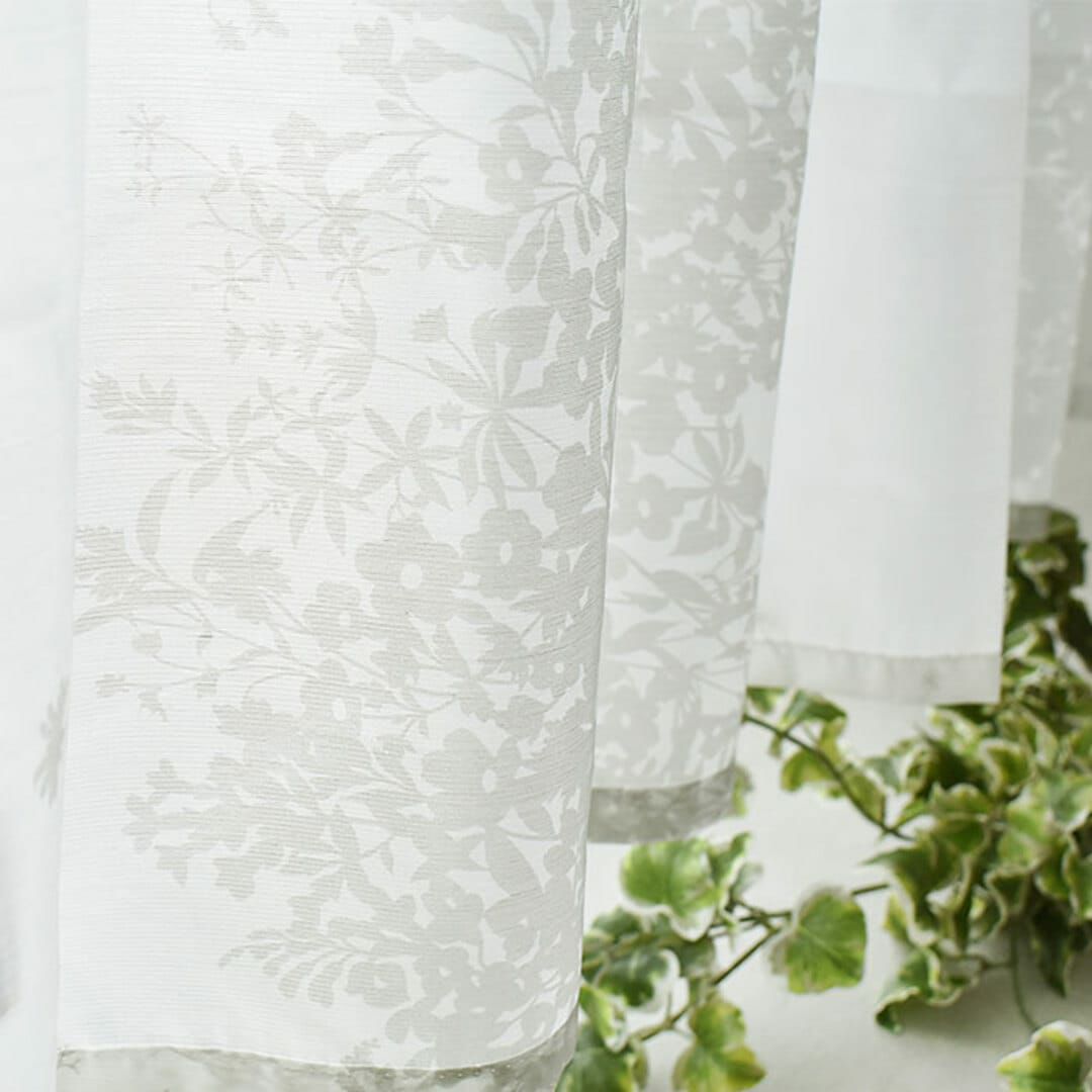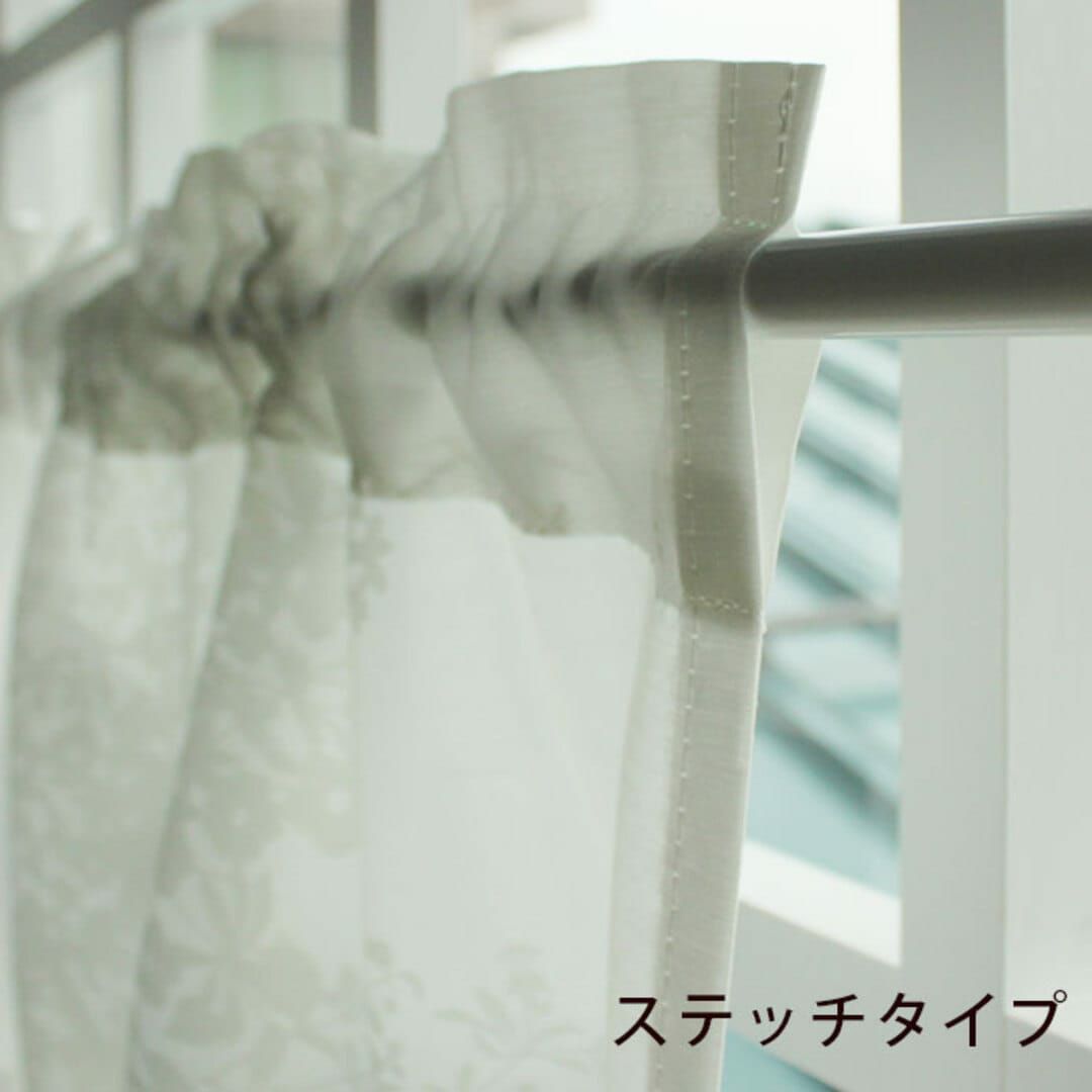 ▲横幅150cm(窓内枠の幅×約1.6倍)×高さ60cm ステッチタイプ さらっと軽い肌触りのボイルレースに美しく上品な縦ラインの花柄シルエット。 横幅を寄せてヒダを作りフワッとさせるとガーリーなかわいい雰囲気になります。