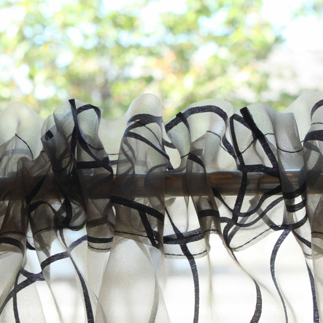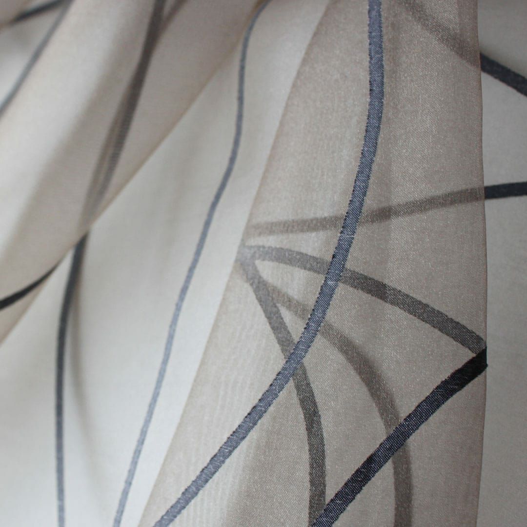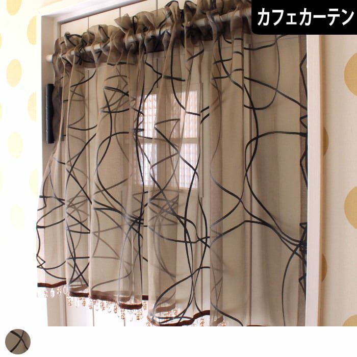 透け感のあるブラウンのボイルレース。 2色の曲線ラインがモダンな印象です。写真は裾トリムビーズ付きですが、こちらの商品はトリムなしとなります。 生地が薄く軽いため長めの高さのカフェカーテンがおすすめです。