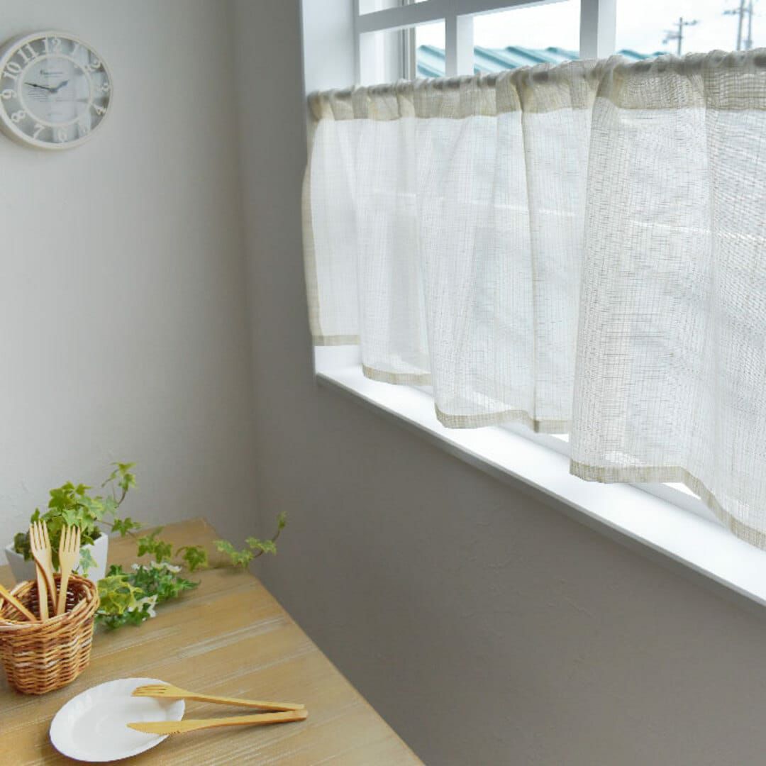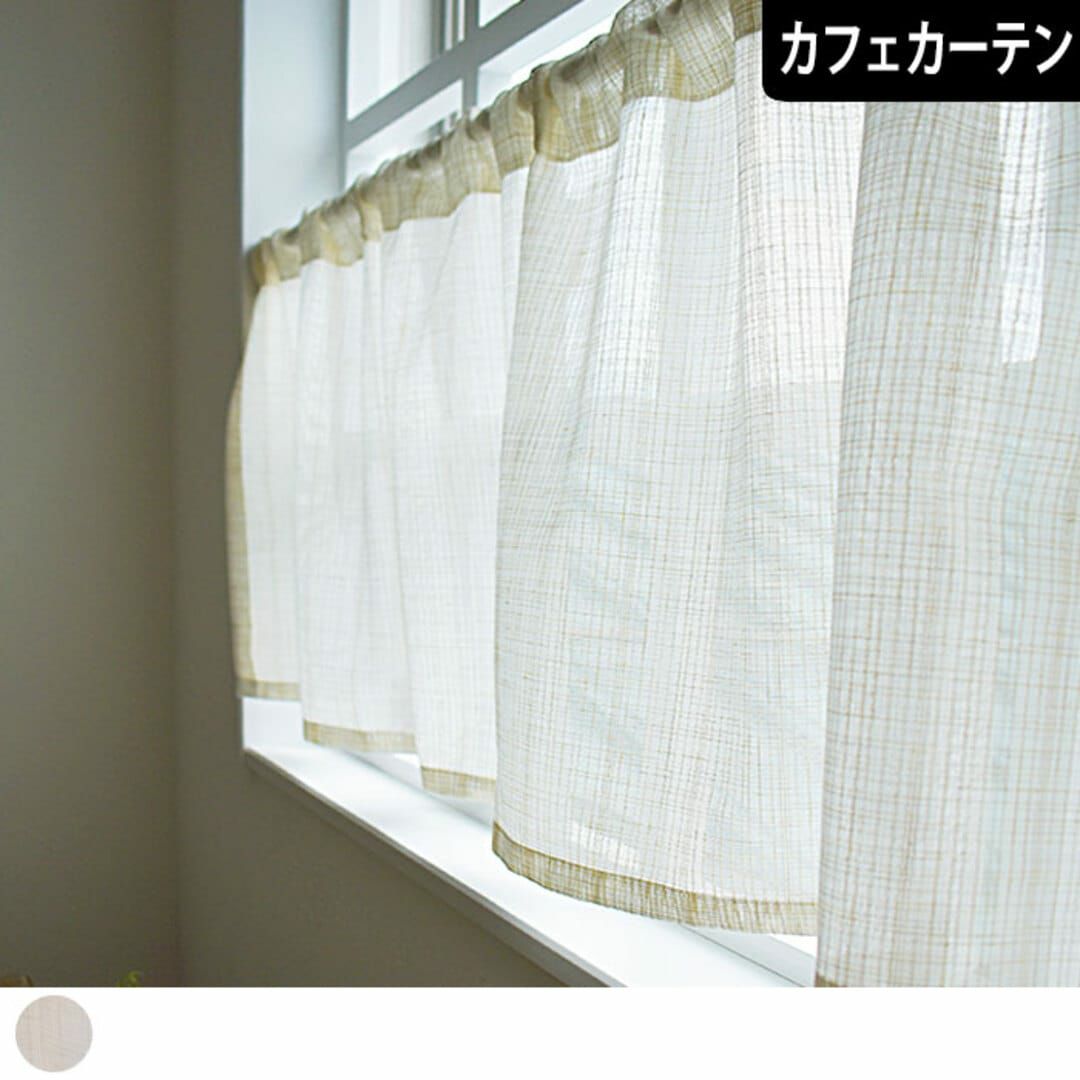 ナチュラルな雰囲気を残しつつ「ミラー加工」を施した、高性能レースカフェカーテン。 麻風のベージュの糸とホワイトの糸が、チェック状に編み合わさっています。 ざっくりとした生地感がとっても素敵です。