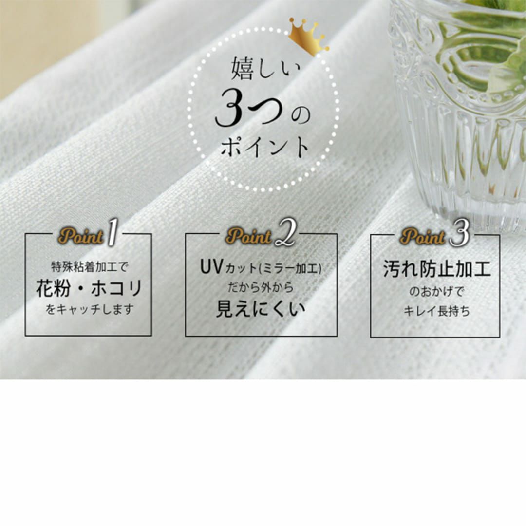 花粉やホコリを吸着して逃さない特殊粘着加工付き! 汚れ防止加工で、吸着した汚れはお洗濯で元の白さに戻ります。 しかも日中外から見えにくいミラーレースでUVカット率62.1%! 花粉症の方にはぜひ試して欲しい、一年中使えるおすすめレースカーテンです。