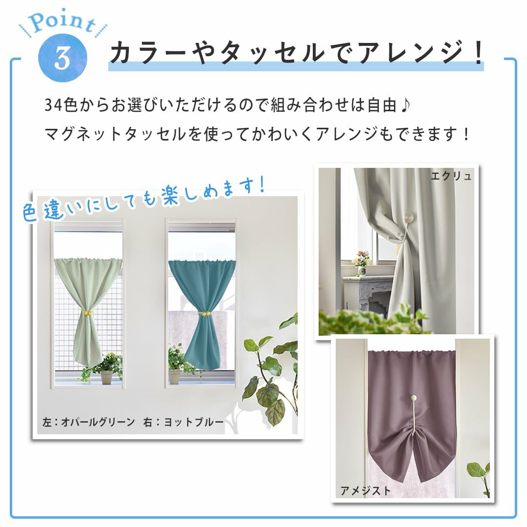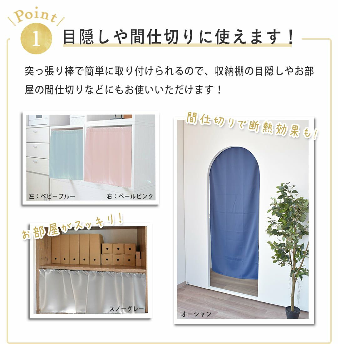 1級遮光、防炎、遮熱、保温の機能を盛り込んだカフェカーテンです。 小窓の陽射し除け、収納棚の目隠し、お部屋の間仕切りなど、突っ張り棒でどこでも自由な使い方ができますよ♪
