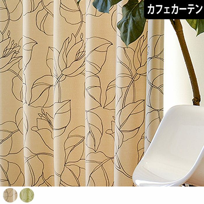 大胆に描かれたボタニカルデザインの遮光2級カフェカーテン。 防炎機能もついて安心です。 大人な北欧モダンインテリアや ナチュラルな雰囲気のキッチンの小窓などにもぴったり。
