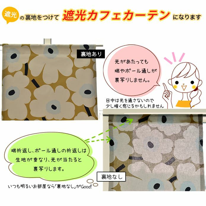 強い日差しからお部屋の家具やフローリングの日焼けを防止したい方、外の光を遮ってTV鑑賞を楽しみたい方、朝の光を気にせずゆっくり寝たい方、そして室内の人影が気になる、プライバシーを守りたい方にもお応えします。 使用している裏地は高い遮光率を持っています。 カーテンの柄は気に入っているけど天然素材で非遮光だったり、窓からの光で柄の色が見えにくくなるのが気になる方は、裏地付きカフェカーテンがぴったりです。