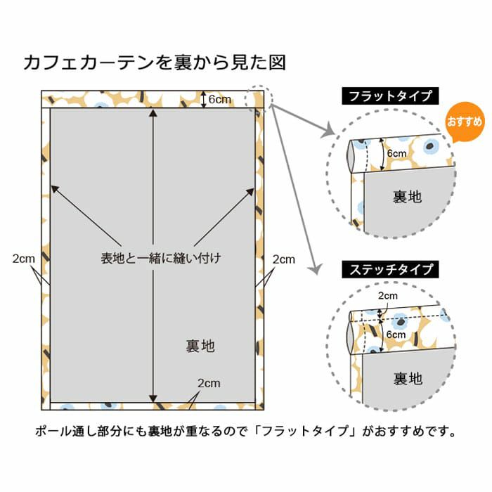 天然素材や非遮光カーテン生地は窓の光をたっぷり受けますが、 遮光裏地をつけることで、遮光、遮熱、保温機能がプラス! 生地も保護して、冷暖房費もお得でエコな裏地付きカフェカーテンになります。