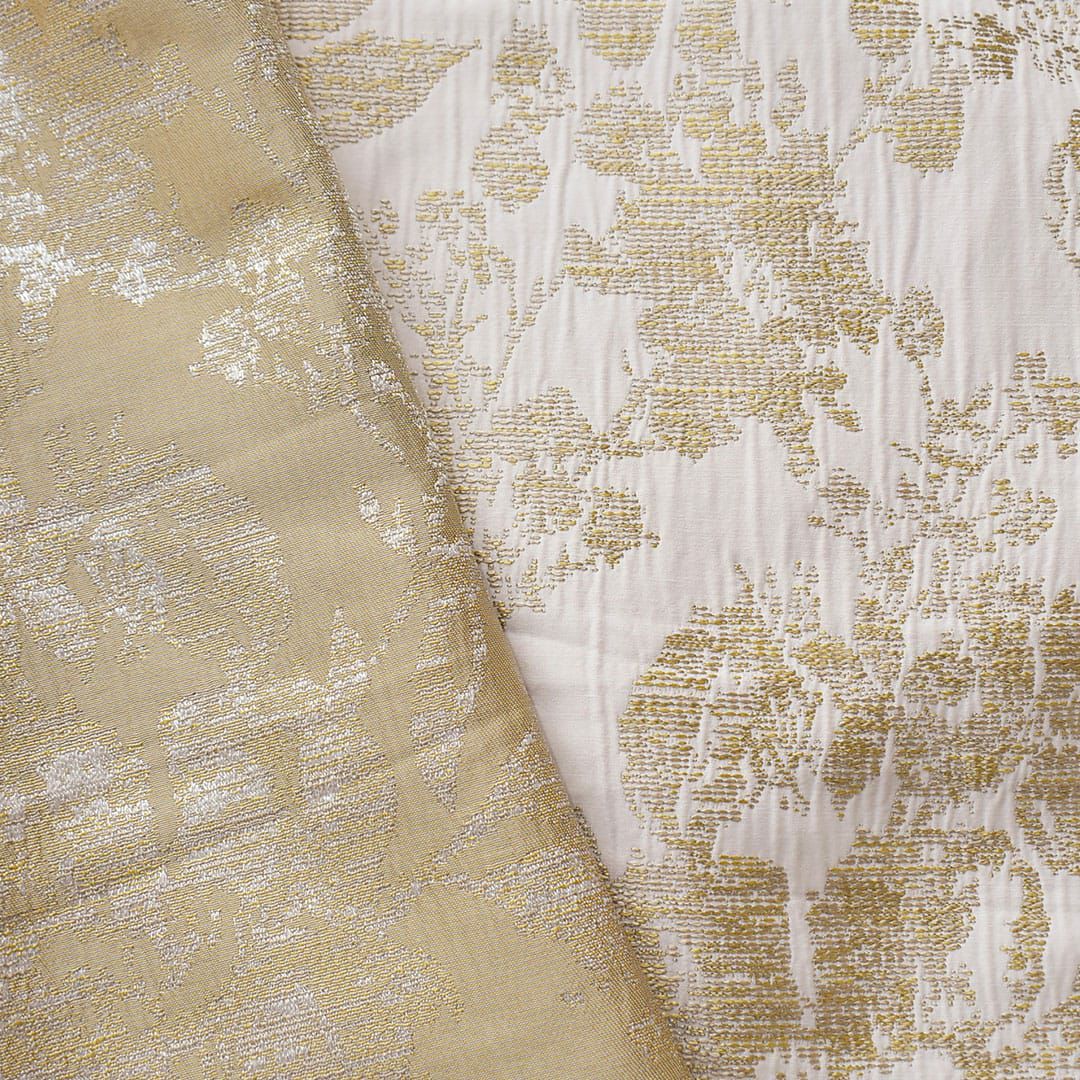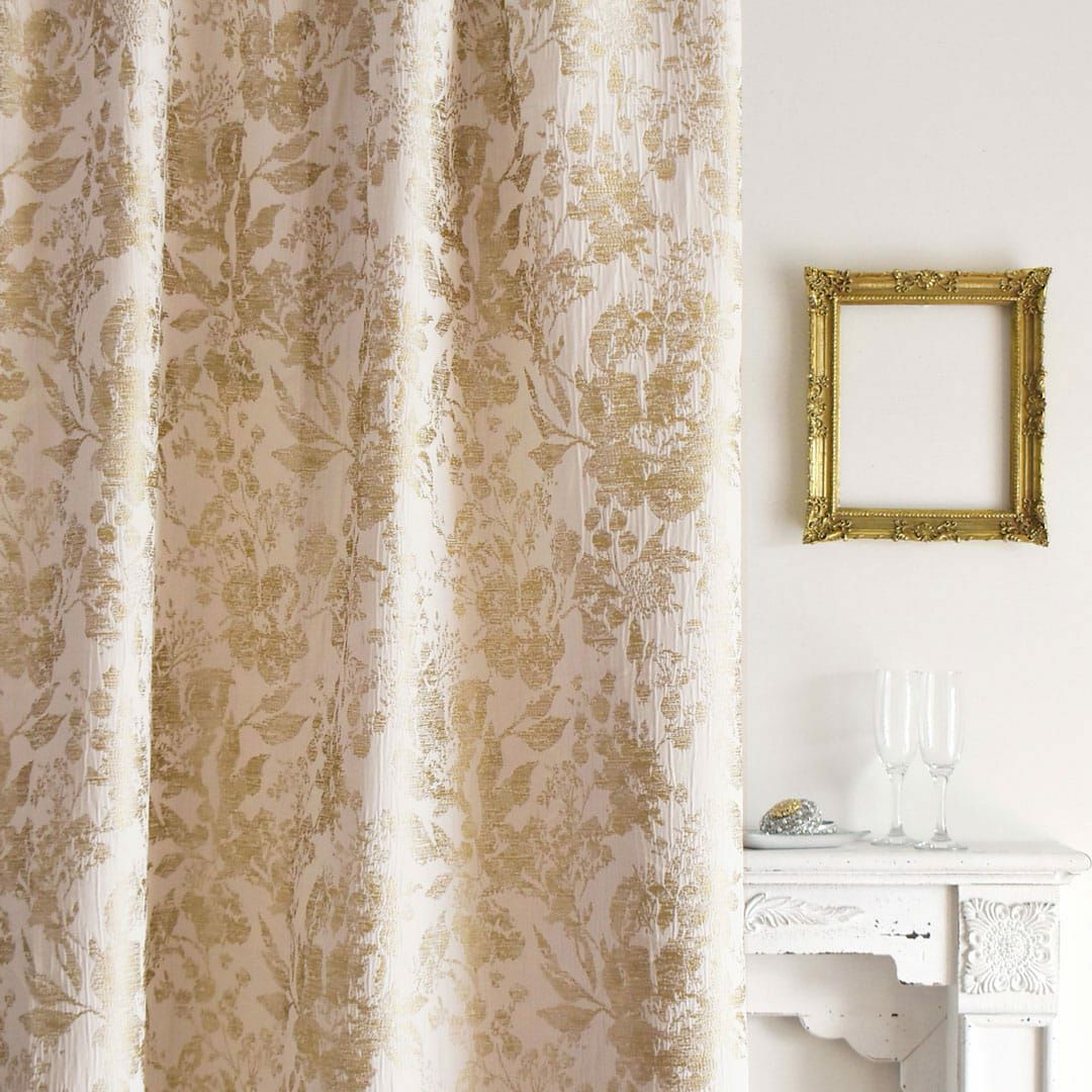 ▲ゴールド エレガントでリッチなジャガード織カーテンがお部屋の印象をワンランクアップ。 アイボリーベージュの地にゴールドの光沢糸で織り上げられた華やかなデザインです。 いざという時に安心の防炎機能付き。