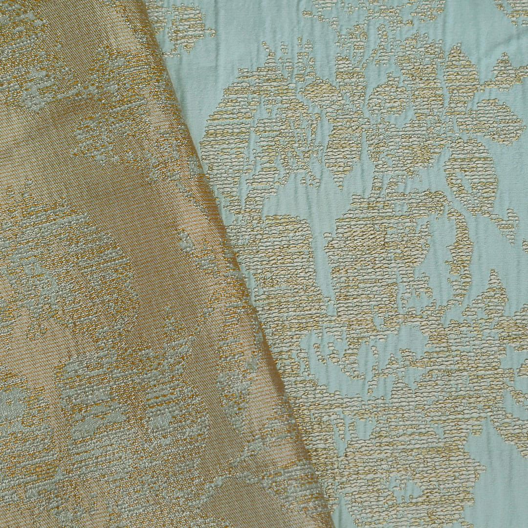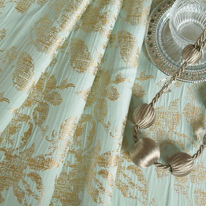 ▲ブルー(使用アイテム:タッセル レイチェル(0179)) 優しげなブルーグリーン地にゴールドの光沢糸で織り上げられた華やかなデザインです。