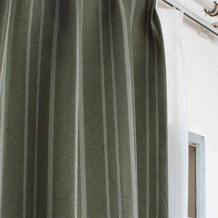 ▲グリーン(遮光1級) グリーンの生地にシルバーの3種類の縦ストライプが入っている織りジャガード地です。シックなストライプカーテンに仕上がっています。メンズライクで品のある生地です。写真は形状記憶加工付きです。