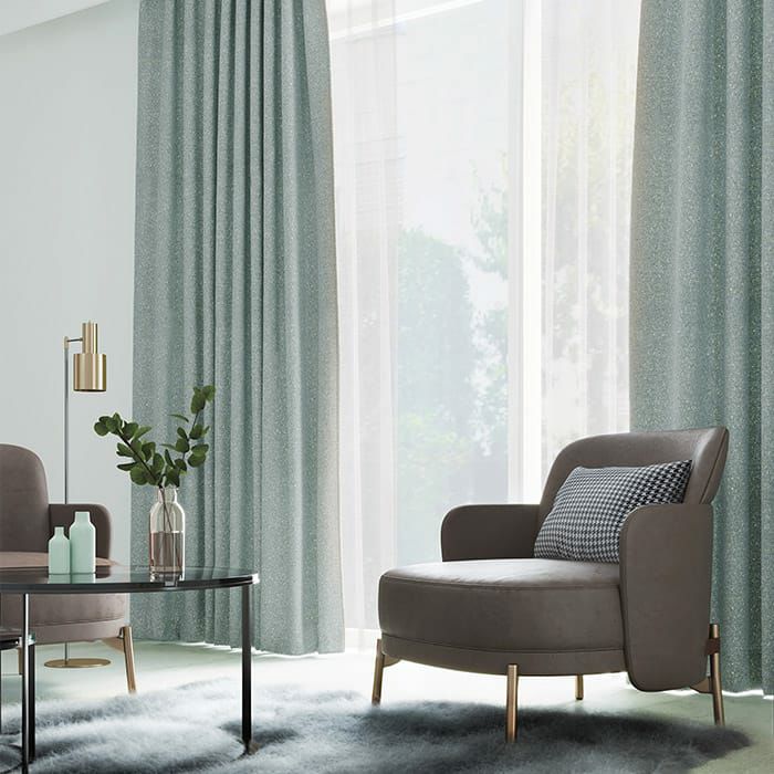 (使用アイテム:レース ジャンヌ、タッセル ふたさらさら(ホワイト)) キラキラが散りばめられたような石目調のデザインがラグジュアリーでシックな雰囲気。 青みがかったクールなブルーグレーの色味とあたたかみのある生地感が調和しています。 ※厚みとハリのある生地のため、形状記憶加工をおすすめします。