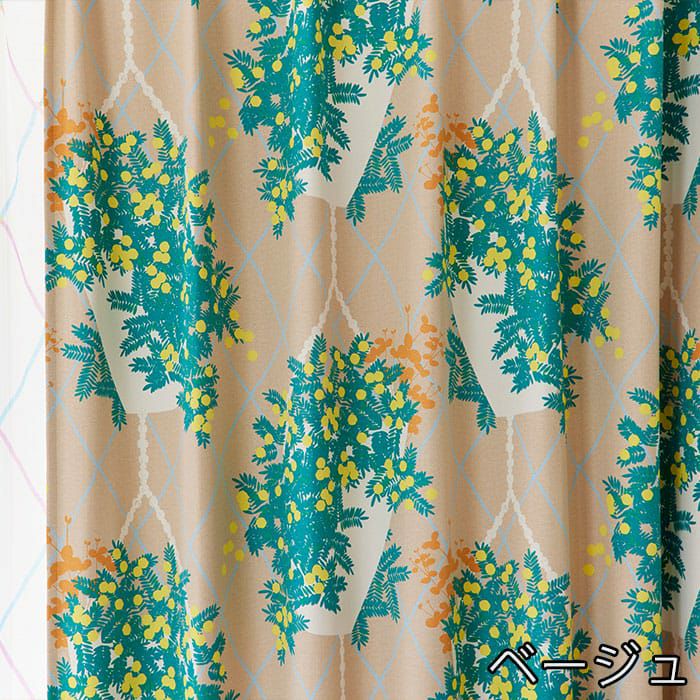 ▲ベージュ フラワーポットを、リズミカルに構成した大胆なデザイン。 この大胆なデザインのカーテンを窓辺につるせば、 お部屋全体をパッと明るく、華やかなにしてくれます。 ※写真は全て1.5倍ヒダ+形状記憶です。