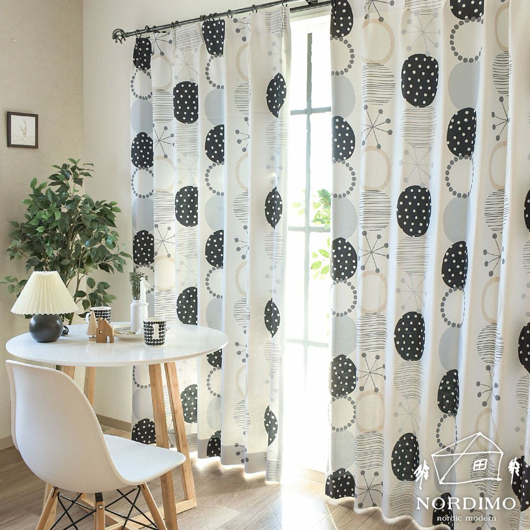 ※写真は全て1.5倍ヒダ(形状記憶付き)です。 当店のオリジナルデザインなのでここだけしか買えません! かわいい丸柄にモノトーンな色合いが モダンな印象を与えてくれる北欧ライクなカーテンです。