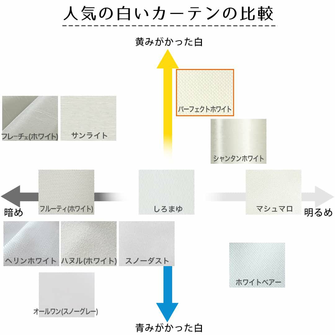 白いカーテンは、それぞれの生地によって色味、明るさ暗さの差があります。当店では人気の白いカーテンを4つのベクトル(黄み/青み、明るめ/暗め)で比較しました。