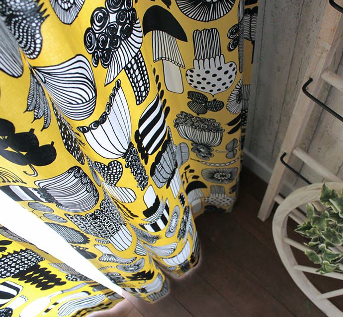 「最高の庭師」を意味するプータルフリン パルハート 庭で育った草花や野菜がいっぱいでワクワクするデザインです。 イエローの生地が北欧らしく、お部屋のアクセントになります。 小柄なので腰窓や小窓におススメです。 デザイナー:マイヤ・ロウエカリ