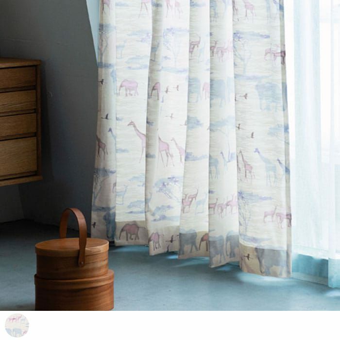 水彩画のようなキリンやゾウが夕日に映えるカーテン 【カーテン】サファリ