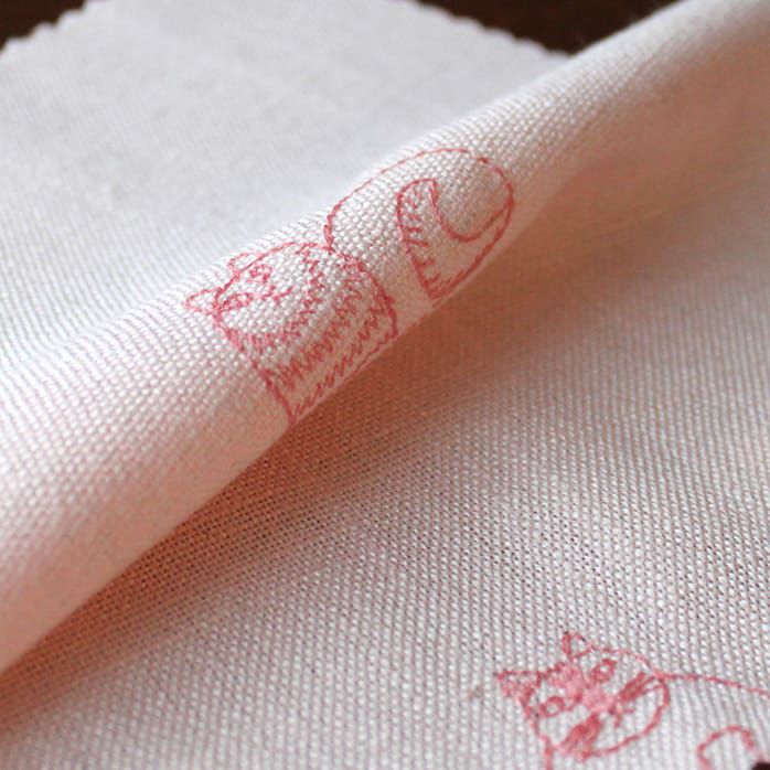 麻を織り込んだざっくりとした風合いの生地に おすまし猫にくつろぎ猫。 丁寧に刺繍が施されており味わい深いカーテンです。 ピンクの生地とグレーの刺繍は大人っぽい雰囲気に。
