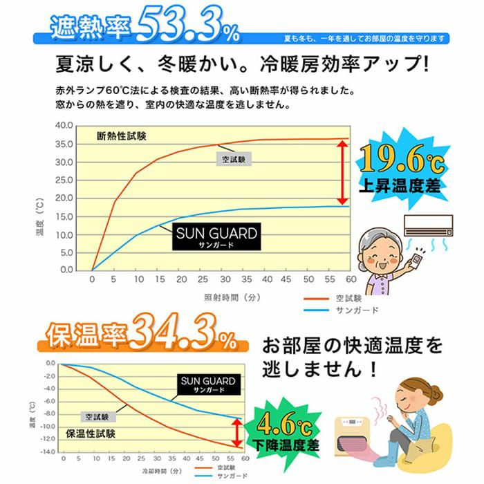 この試験で得られる「保温効果率」は、カーテンが室内温度の下降をどれだけ抑えられるかを示す指標です。比較の結果、「サンガード」は4.6℃温度低下を抑えていることがわかります。