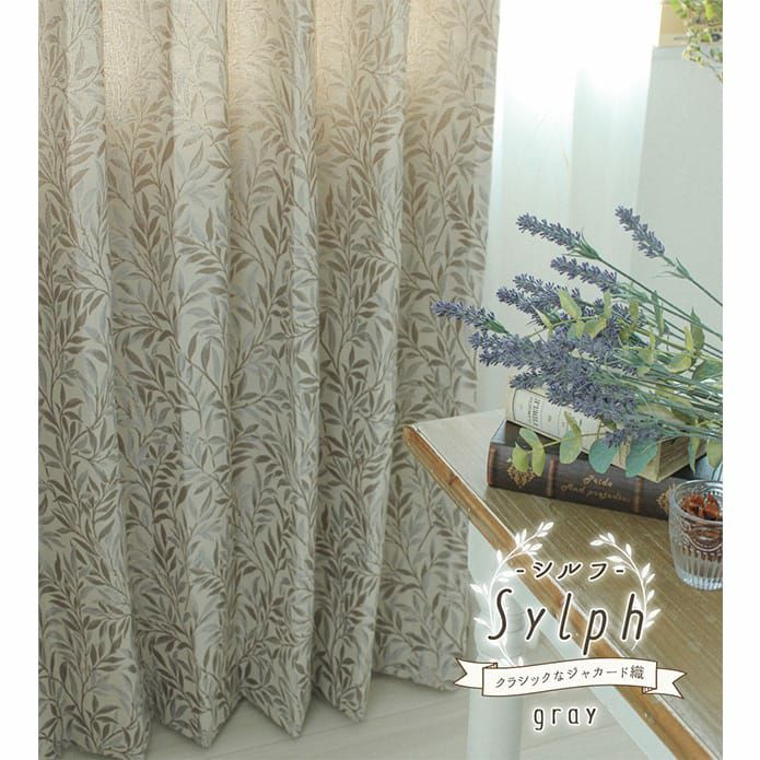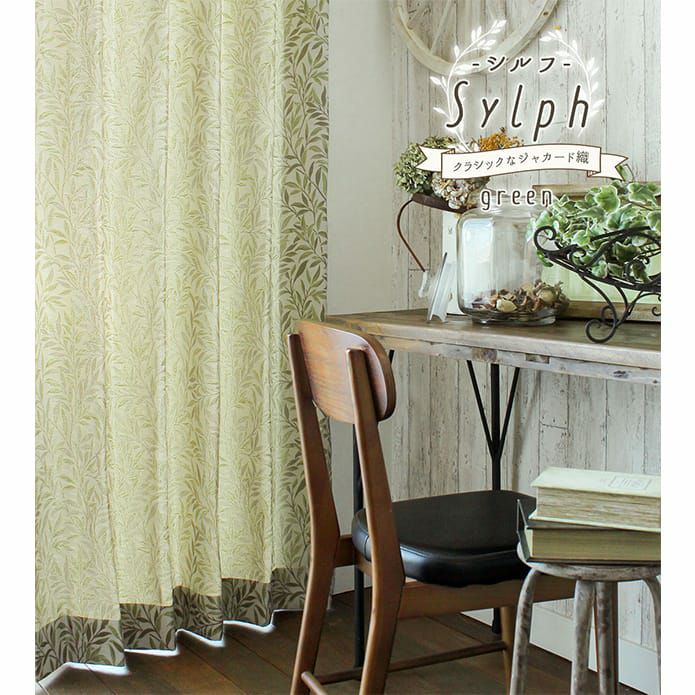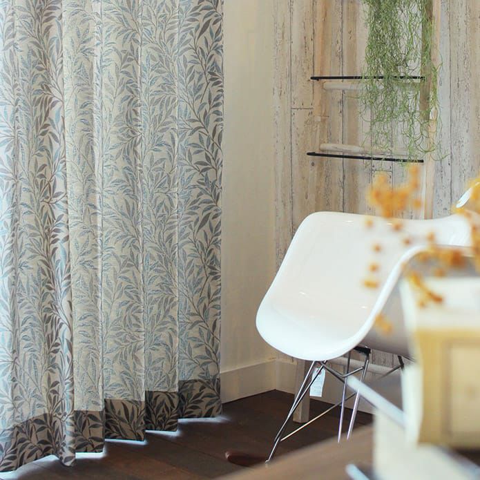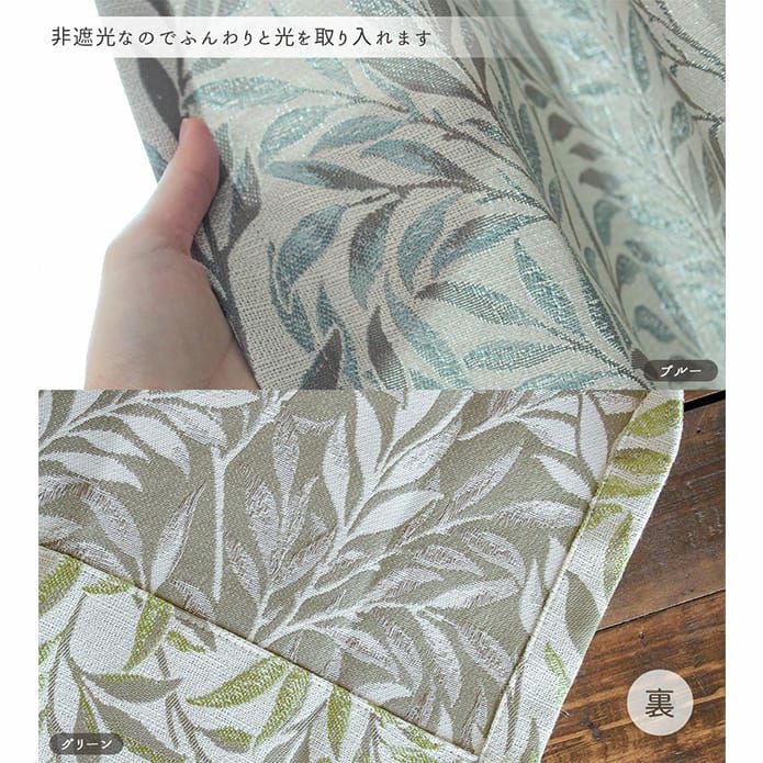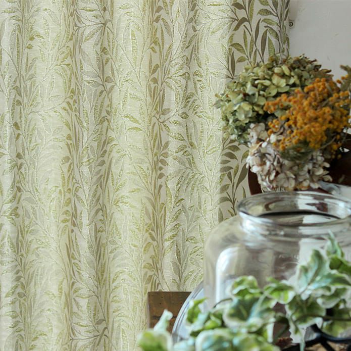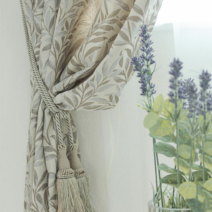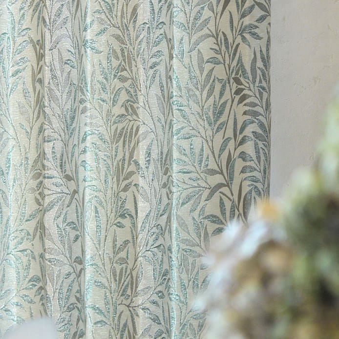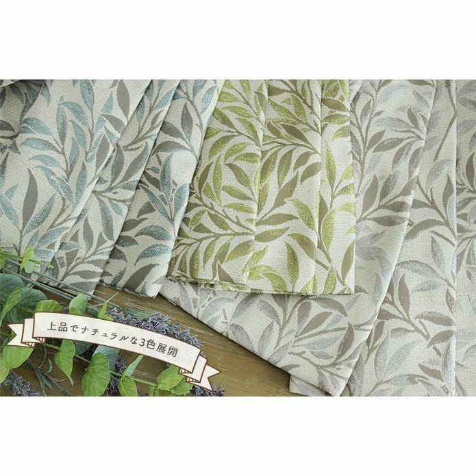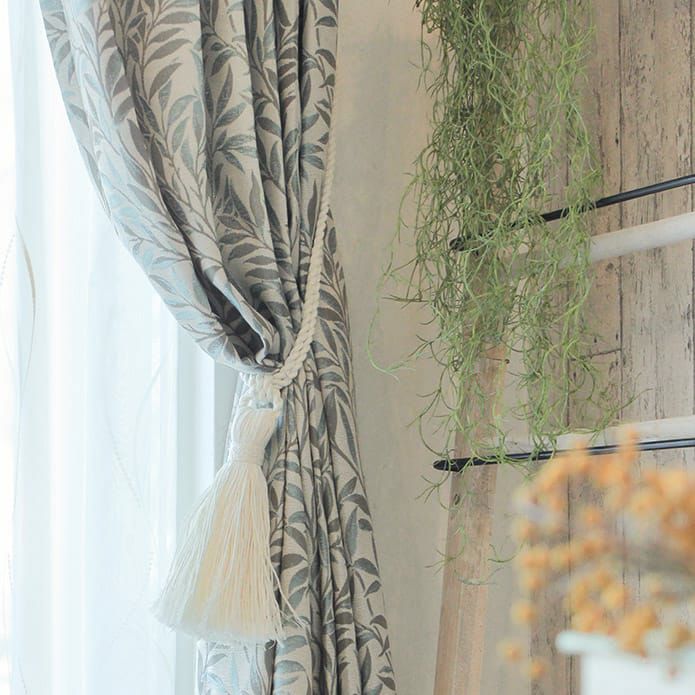 ▲タッセル:ふたさらさら(エメラルドグリーン)、レース:トルコレース リップル(グレー) ※写真は2倍ヒダです。 一面リーフ柄のクラシックなボタニカルデザインのカーテン。 優しく明るい色合いとナチュラルな風合いでリビングにぴったり! シャビーな雰囲気のお部屋や、シンプルでシックな北欧インテリア、和室にもマッチします。