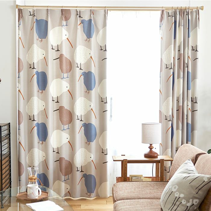 2本脚でテクテク歩く、翼のない鳥「キーウィ」をデザイン。 長いくちばしと丸いフォルムがポイント。 イエローはキーウィの好奇心旺盛なイメージを、 グレーはキーウィの人懐っこい味わいのある雰囲気を表現しました。 遮光2級なので程よく光を遮ります。