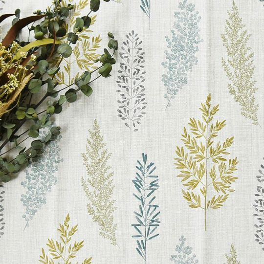まるでリネンのような素材感のナチュラルな生地に水彩タッチのグリーンの枝葉のデザインがプリントされています。このシャビー感のある生地は糸で織りで表現されている為、裏面も表と同じ表情をしています。